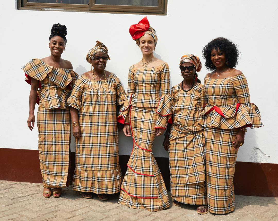 For this part, she went back to her roots; Ghana for a family campaign shot. In the photo, she and four women including her grandmother and aunts are shown wearing traditional Ghanaian dresses designed by her aunt but made of vintage Burberry fabrics. In the caption, Adwoa shares her relationship to her heritage in Ghana where her father was born, and how it has shaped her.