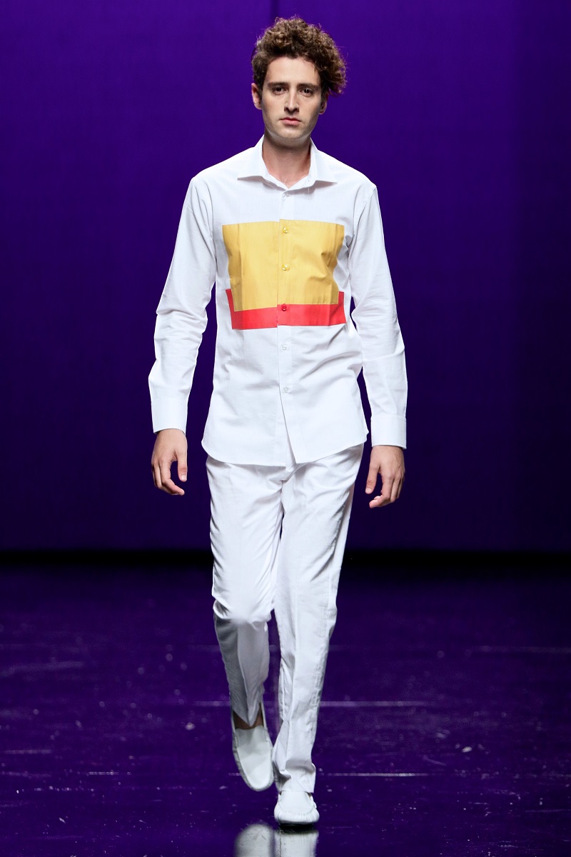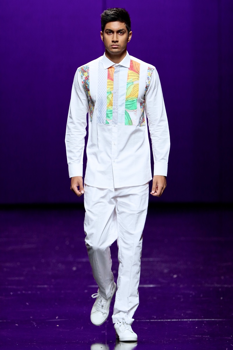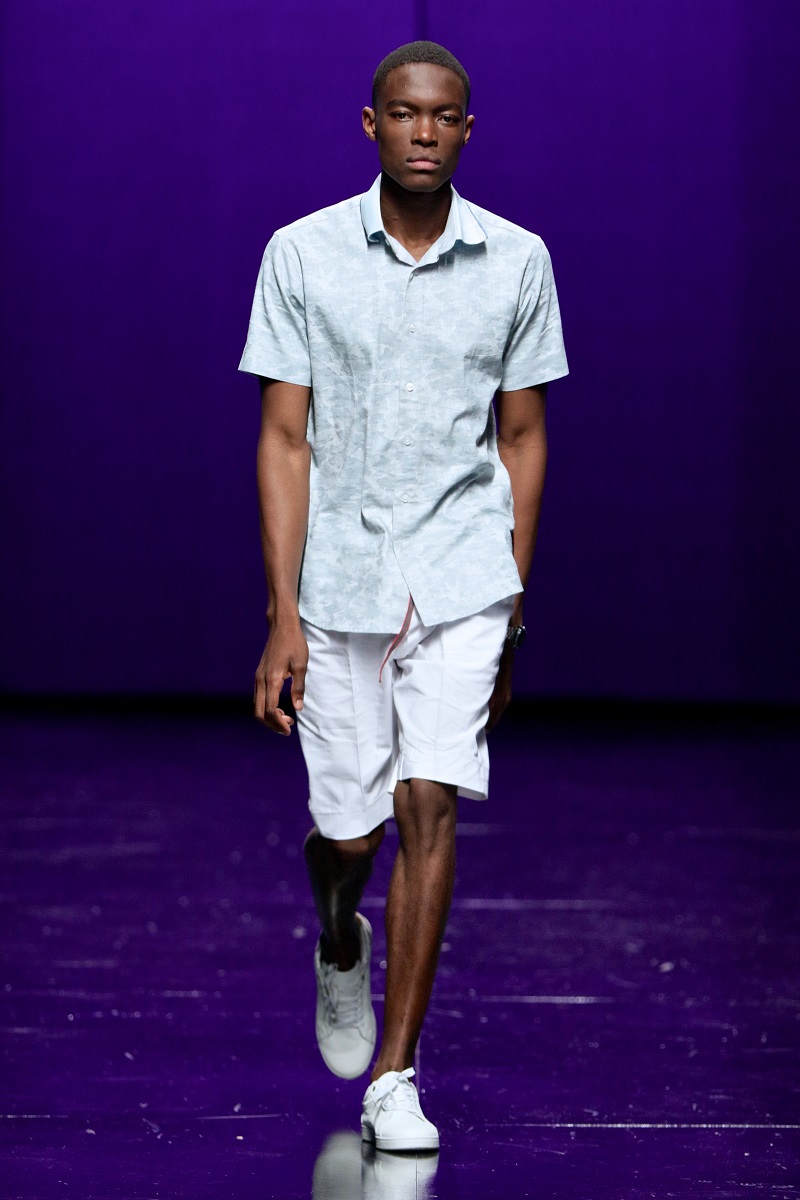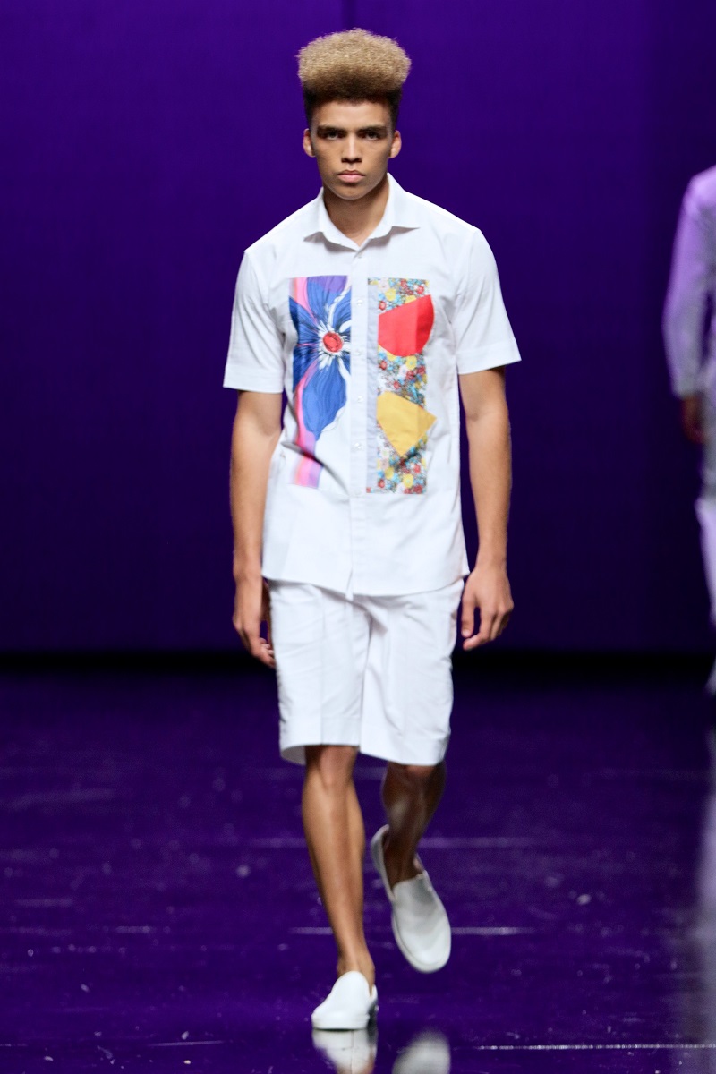 The highly anticipated collection debuted with a stream of crisp white tailored creations, awash with an array of multi-coloured designs on the shirts in every shade of the rainbow paired with loose-fitting white trousers and shorts.