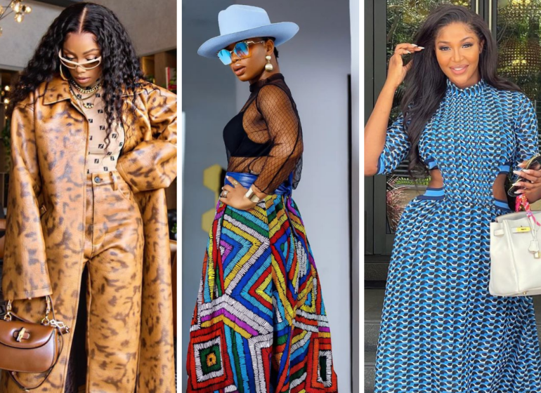 The mesh ruffles on the form-fitting midi look perfectly complimented the pretty Ankara prints and her glowy skin. For the evening event, Adesua wore simple accessories; bold gold hoop earrings, a thin bracelet and of course her platinum wedding ring all paired with a nude pair of pumps.