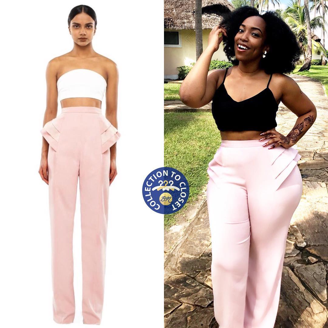 These elegant wide leg trousers in a pretty baby pink colour, have a high waist cut with flattering tiered peplum details on both sides. Eki wore the Andrea Iyamah piece with a black, spaghetti strap crop top from Topshop.