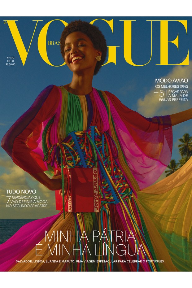 Angolan model Blésnya Minher is the cover girl for Vogue Brasil‘s latest issue. Lensed by Zee Nunes, the top model wears a bright and colourful Dolce & Gabbana dress paired with Talento earrings.
