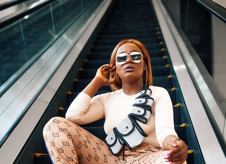 The louche yet glam look was completed with a matching grape clutch, oversized, mirrored sunglasses and statement earrings.
