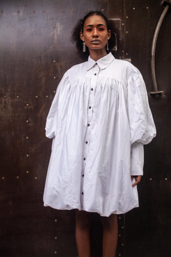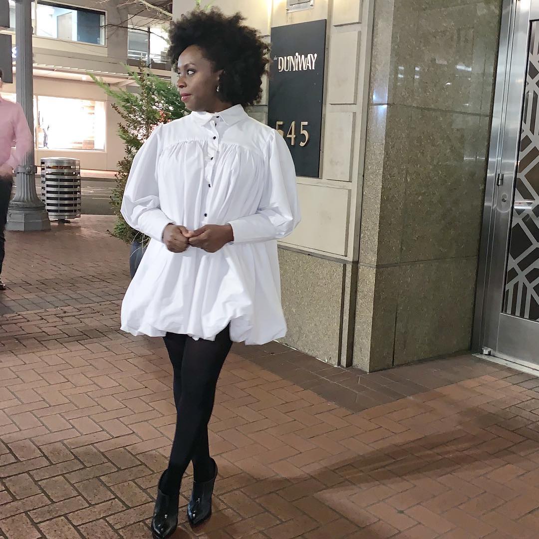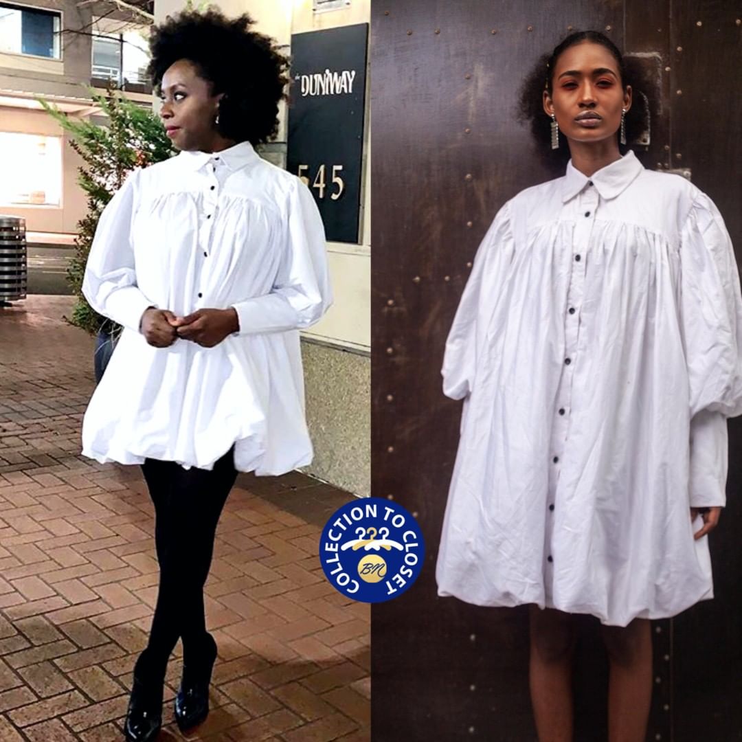The button down monochrome shirt dress which Chimamanda sports is from the brand’s Spring/Summer 19 collection titled The Skin Under and has interesting subtle details which helps it all come together. Subtle and not-so subtle details like it’s small pleats, bishop sleeves and puffy buttons that makes it al the more fashionable. Chimamanda then finishes the ensemble with a pair of opaque tights and glossy black ankle boot heels nailing the monochrome chic look!