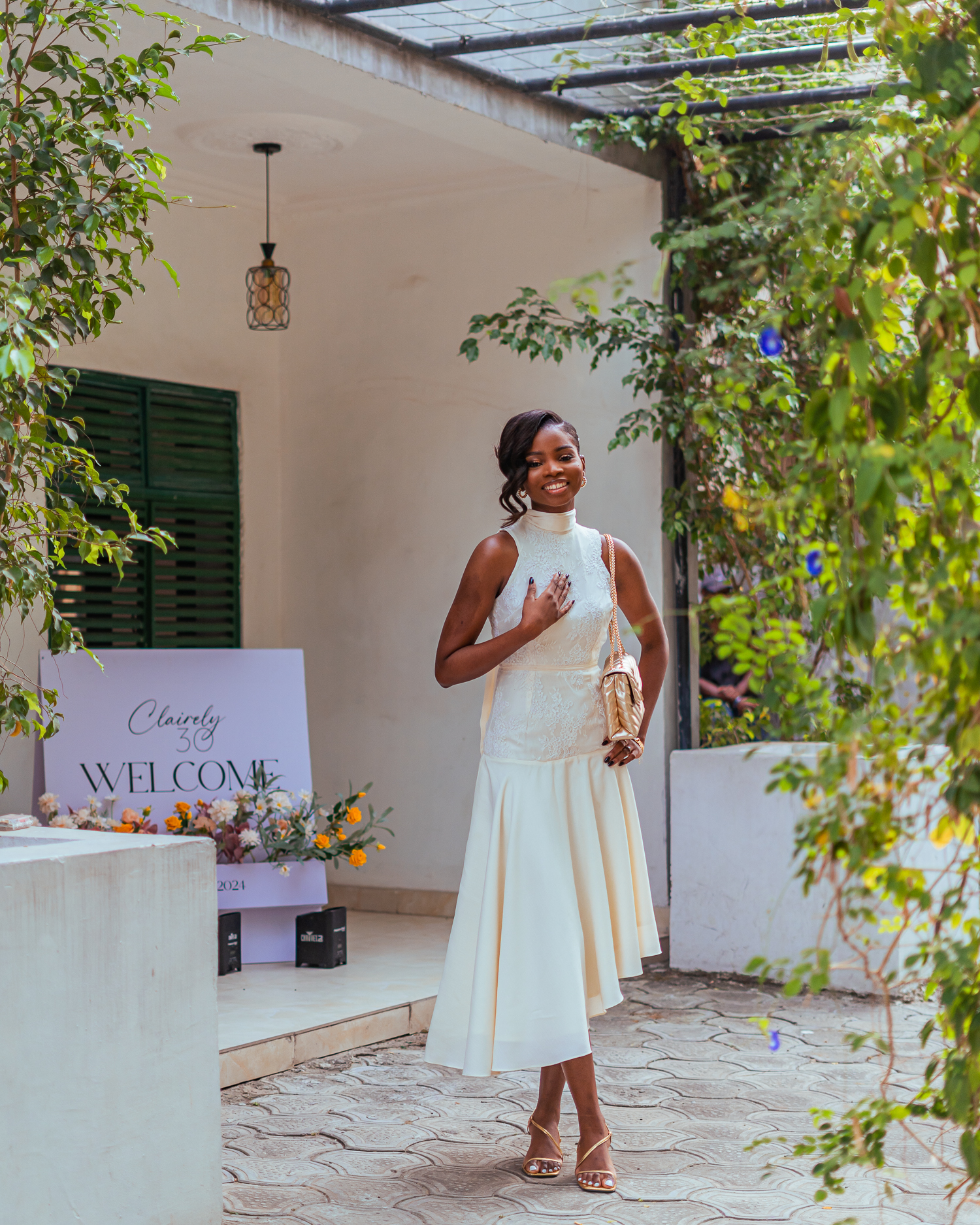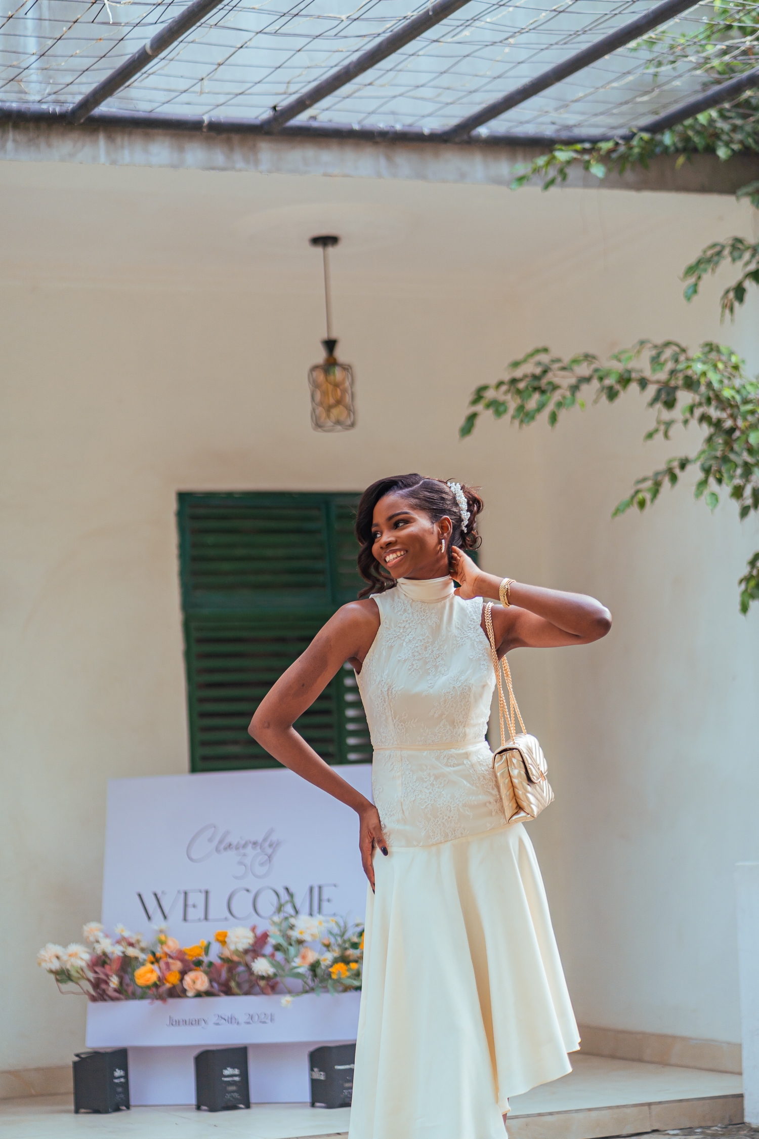 Stepping out in a cream-coloured hip-flare dress paired with strappy gold heels, bag and jewellery, Claire rocked a classy updo with a side fringe, minimal makeup and dark-toned manicure for her celebration.
