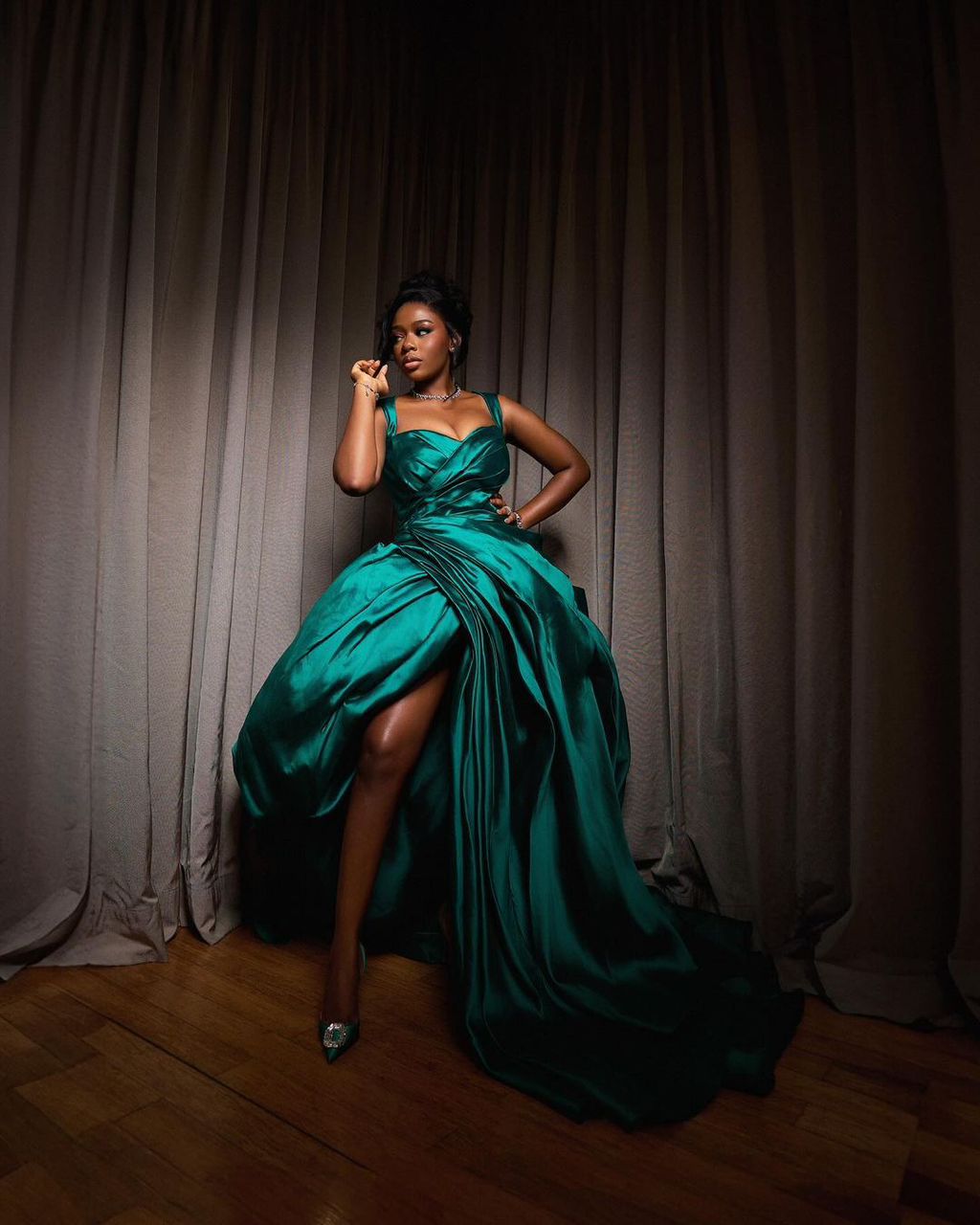 The addition of a slit gave it a trendy touch. Its train cascaded from the front, all the way to the back and her green pumps which boasted a brooch completed the monotone look. Diane paired the outfit with a chic bun plus tendrils on one side. Her makeup was soft and she rocked crystal accessories finishing the look with dainty earrings and a simple neckpiece from Swarovski.