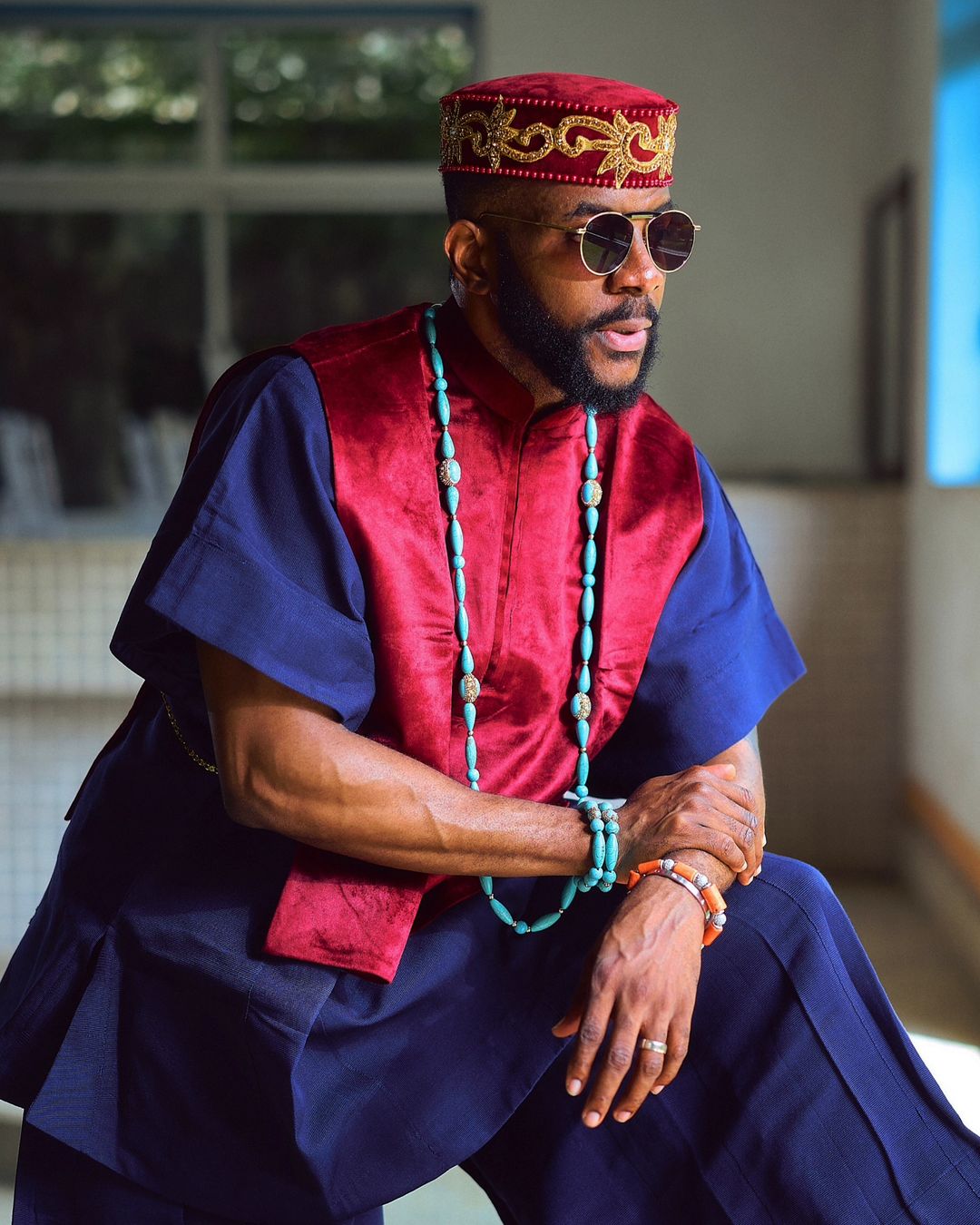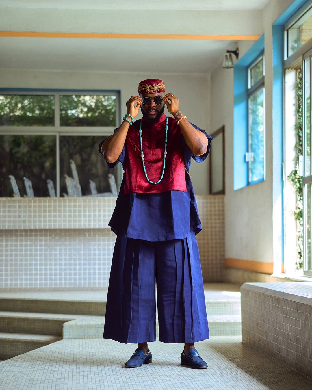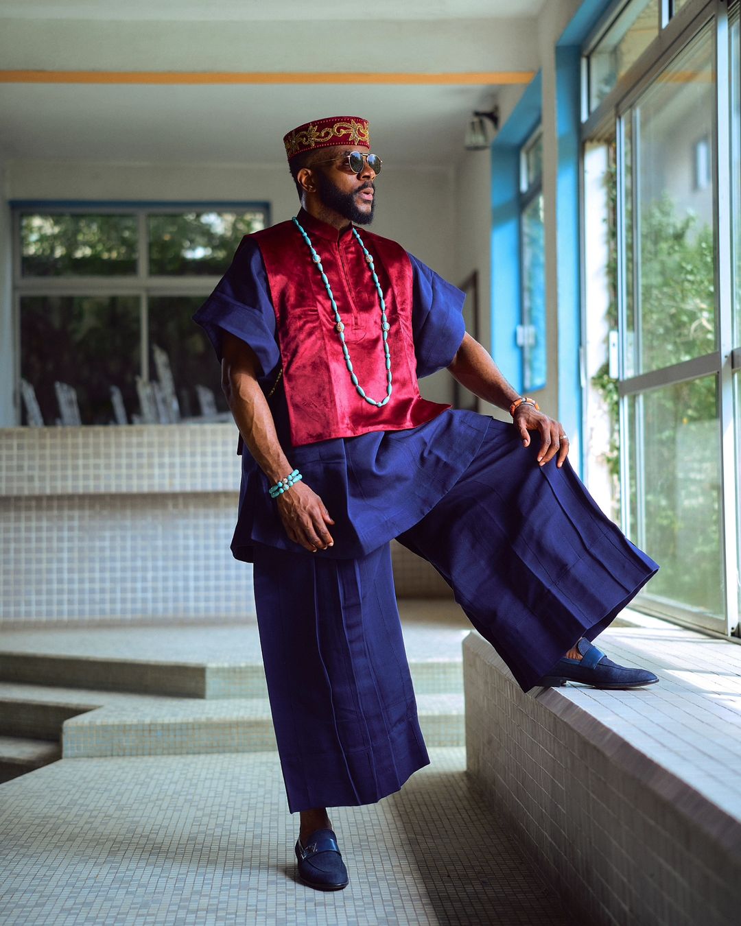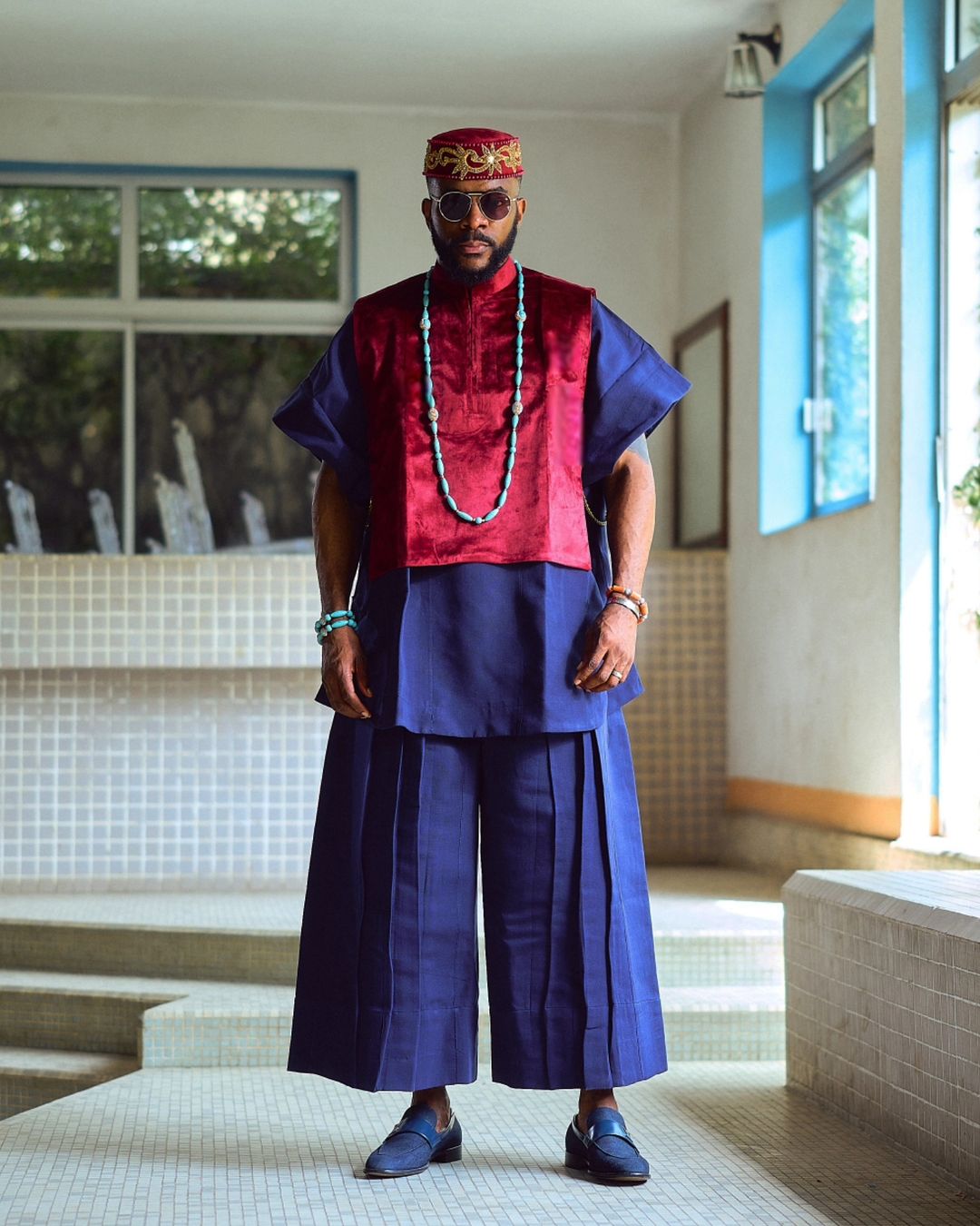 Exuding royalty in a stunning two-piece outfit by designer Ugo Monye, the ensemble, an elegant blue set in a deep blue hue, featured wide-legged cropped trousers, known for their distinct flow and structure, and a top adorned with a striking red layered fabric across the front. Ebuka’s look combined traditional and modern elements effortlessly, making him the undisputed fashion king of the night.