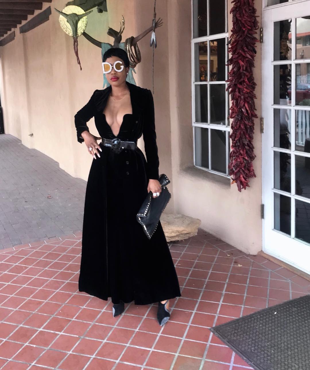 Sai Sankoh: The reigning influencer queen of old school glam, Sai has worn hers not once but twice. First, in a daring black Giorgio Armani dress with aplunging neckline, John Anthony bolero-style jacket, Rene Caovilla shoes and a Valentino Rockstud clutch for lunch, then to dinner clad in a decadent purple Cushnie et Ochs dress emboldened with a matching turban, Rene Caovilla shoes, a luxurious fur and the statement glasses to complete her look.
