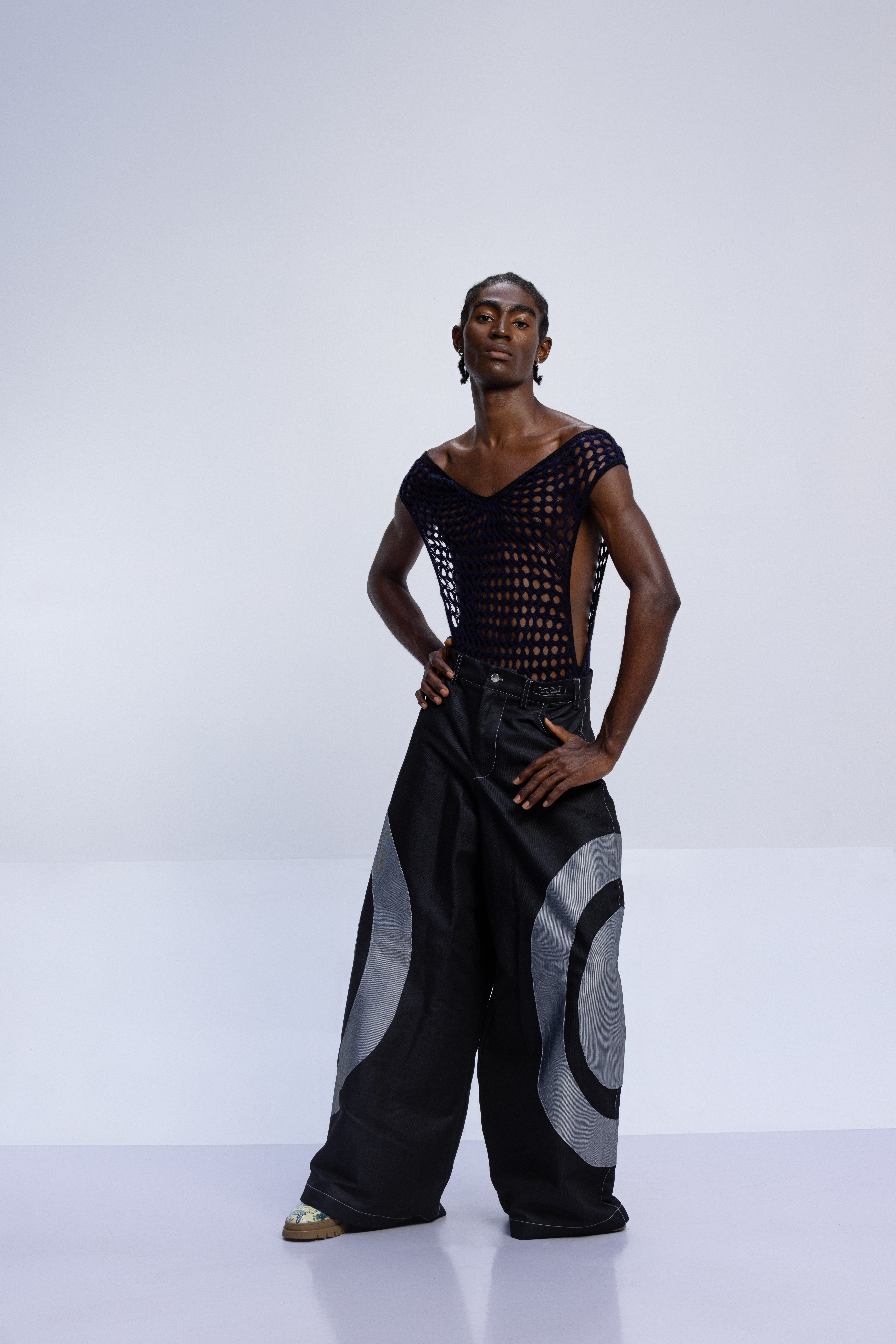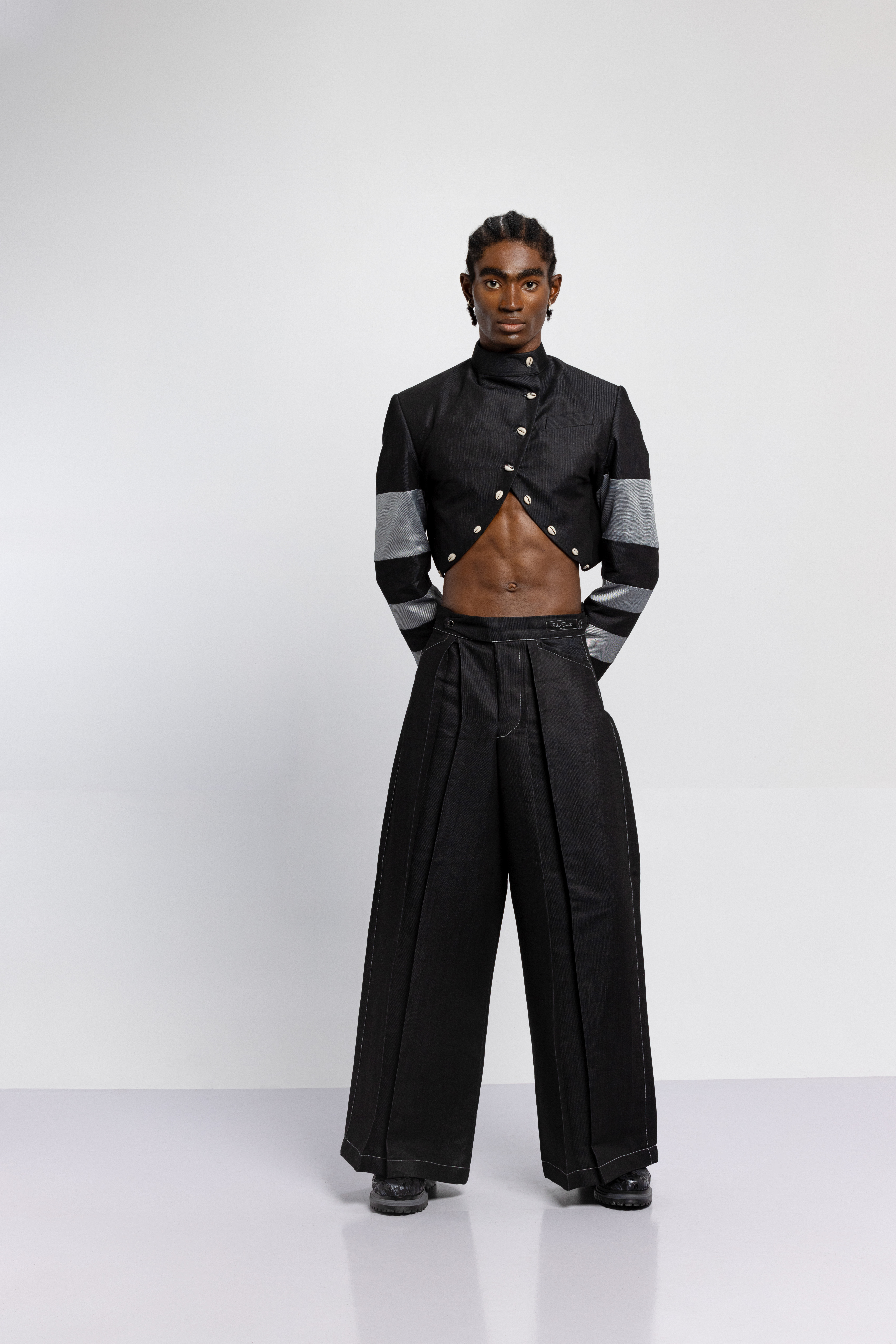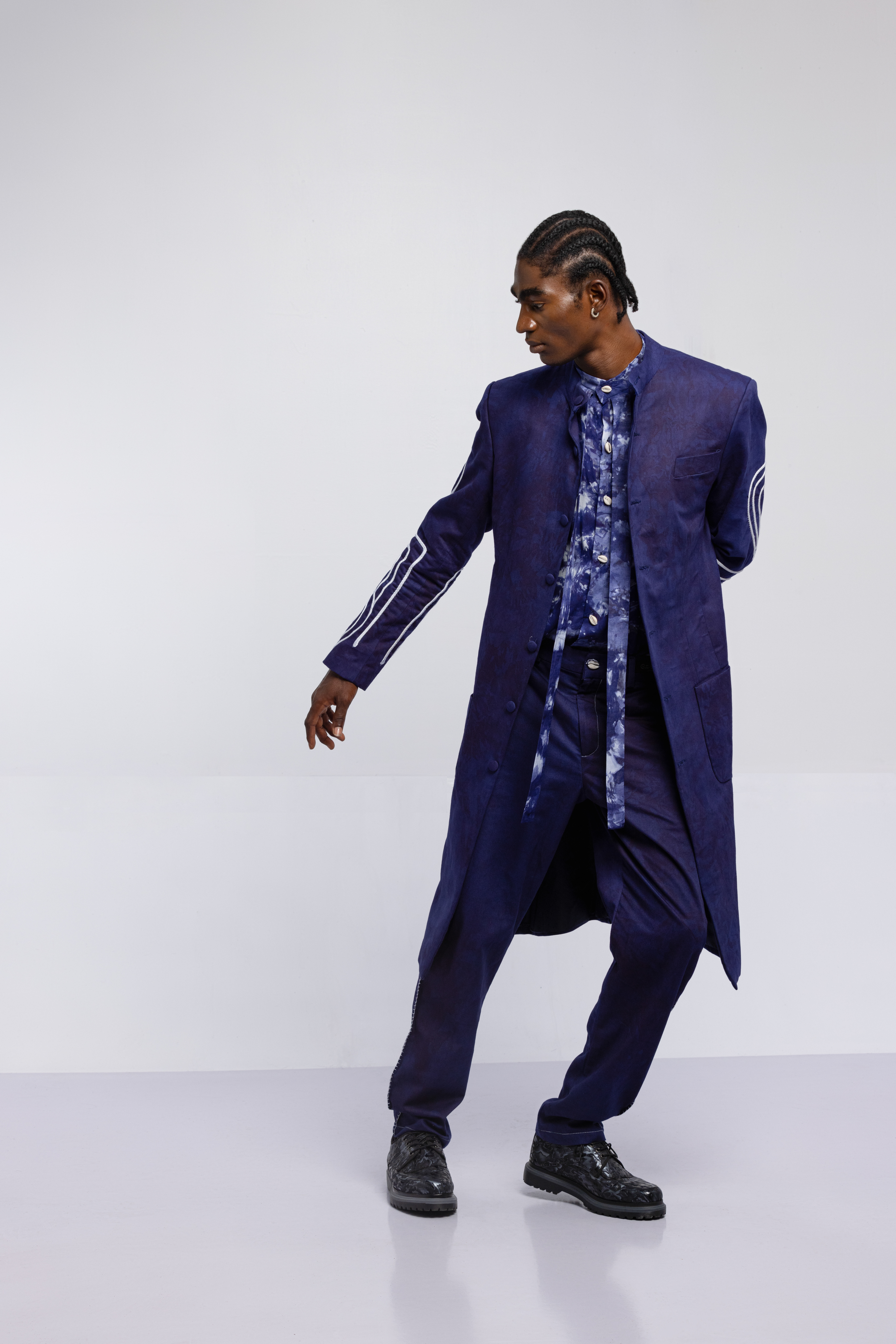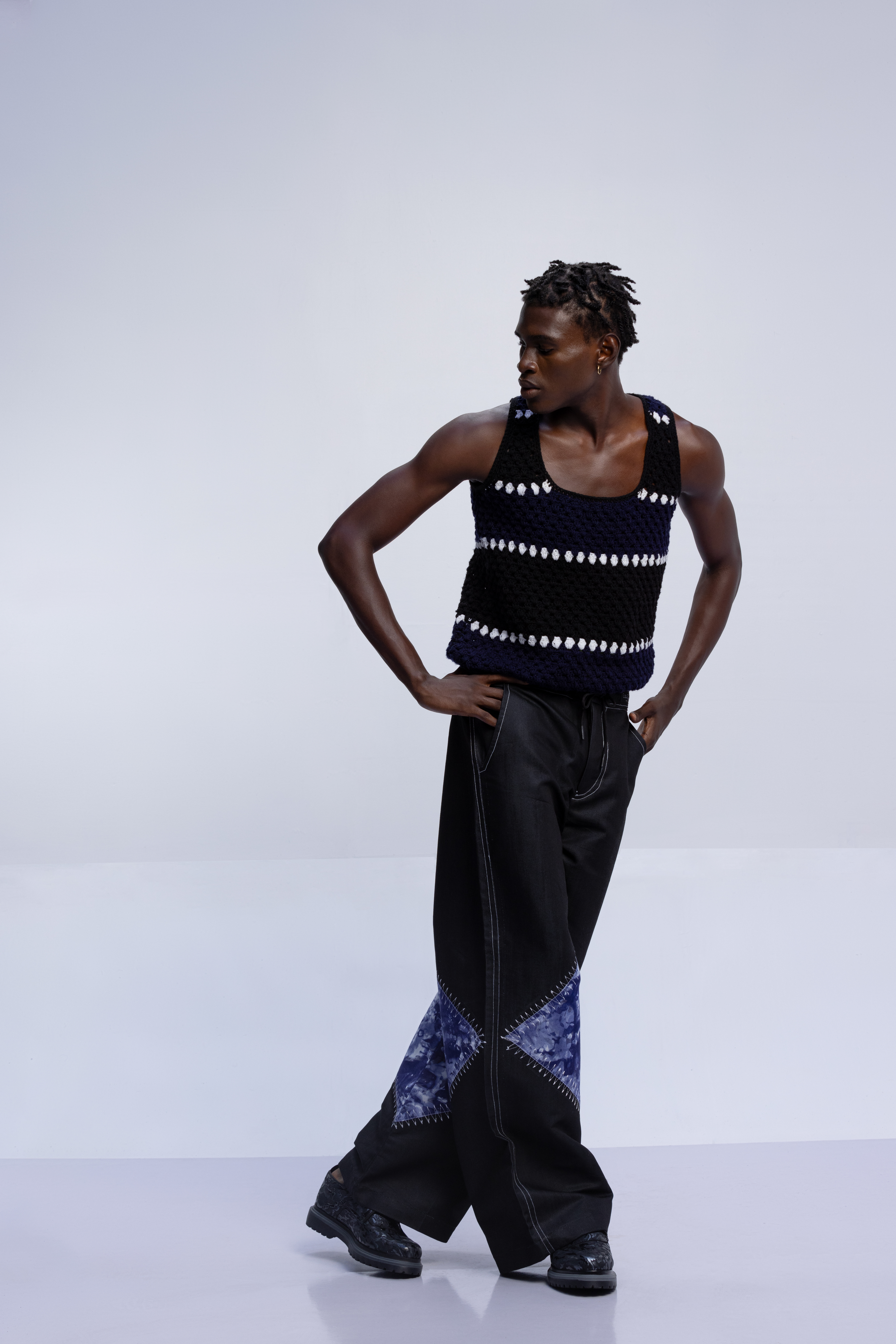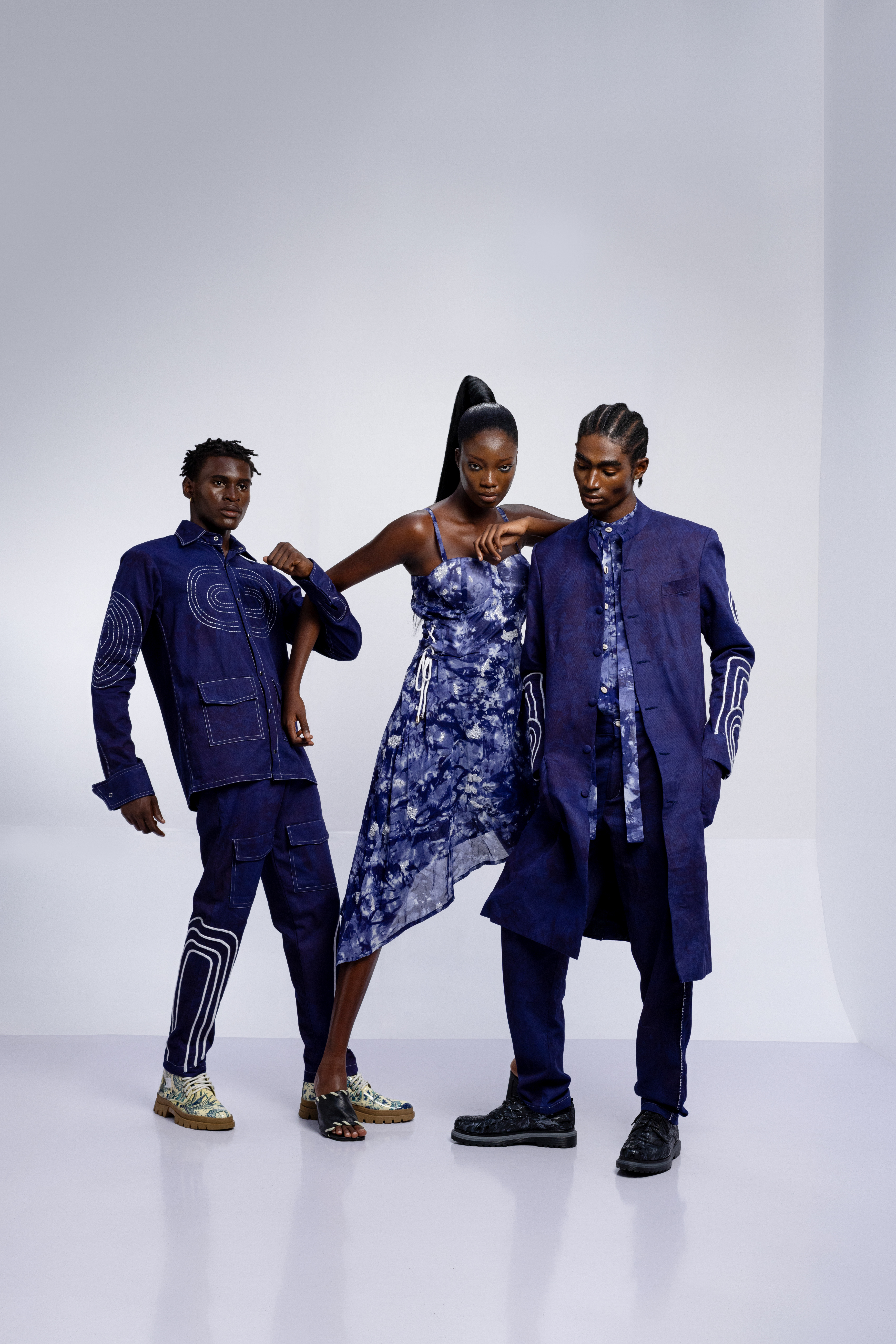 The tattoos we see today have replaced the scars that once were etched on the skin. Igboya is a reminder of the resilience of African culture, which still perseveres while evolving. This collection is nothing less than a visual symphony, with intricate embellishments, knitted pieces, and masterful textures that celebrate the monochromatic palette of black, white, grey, blue, and green. Each color tells a unique story that is etched in scars.