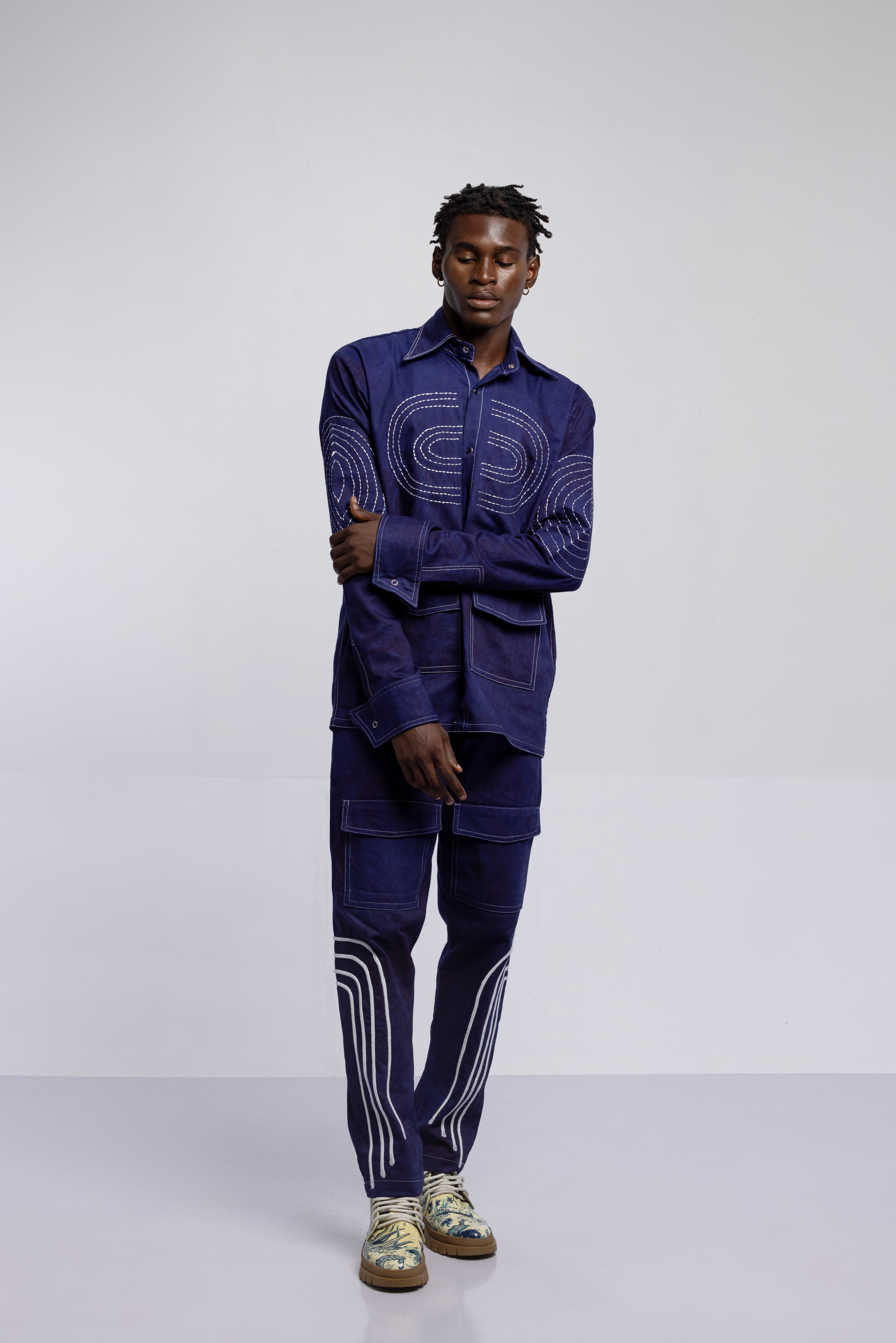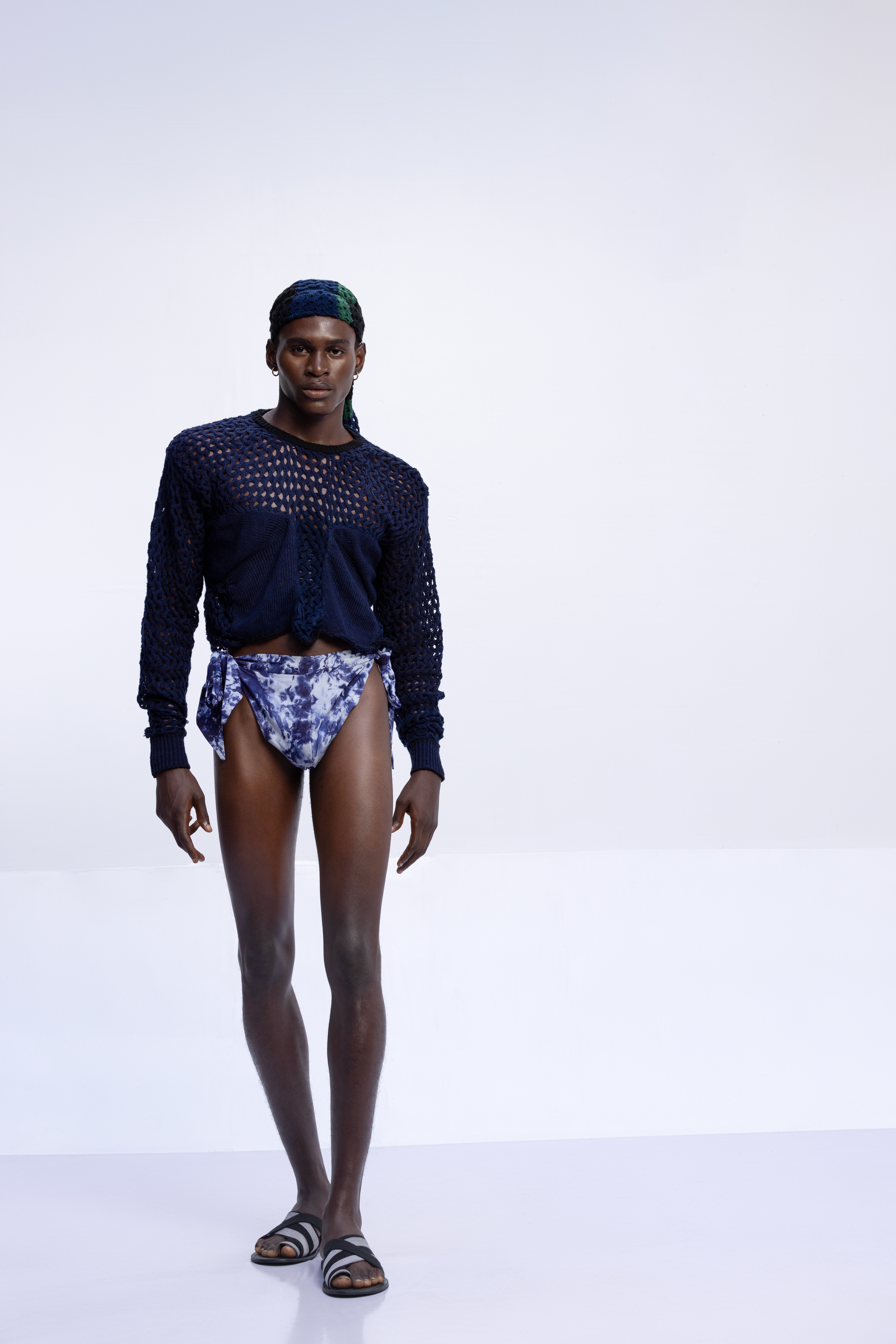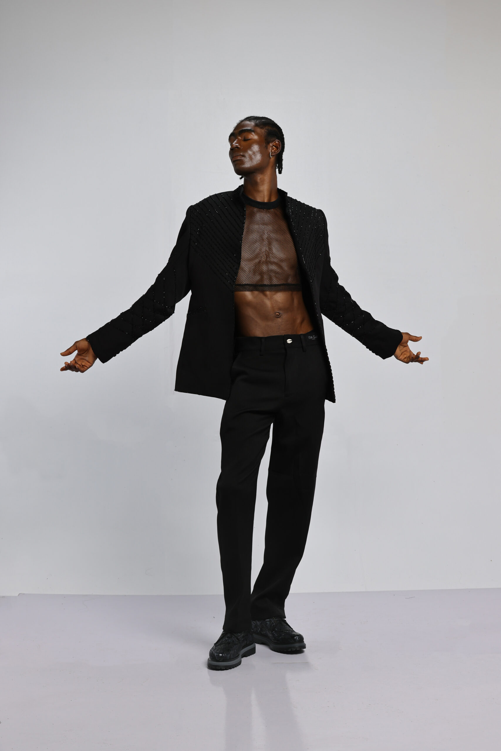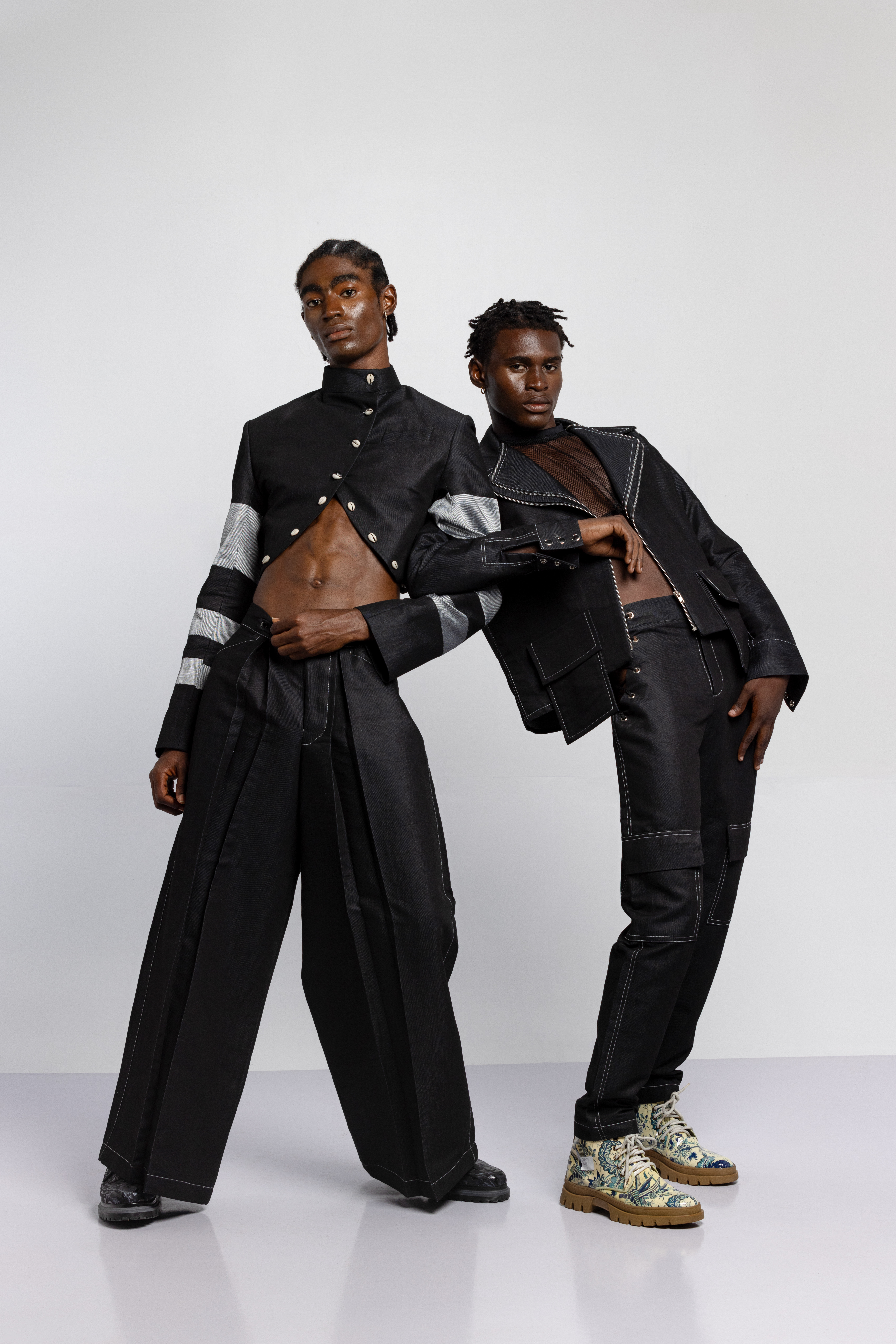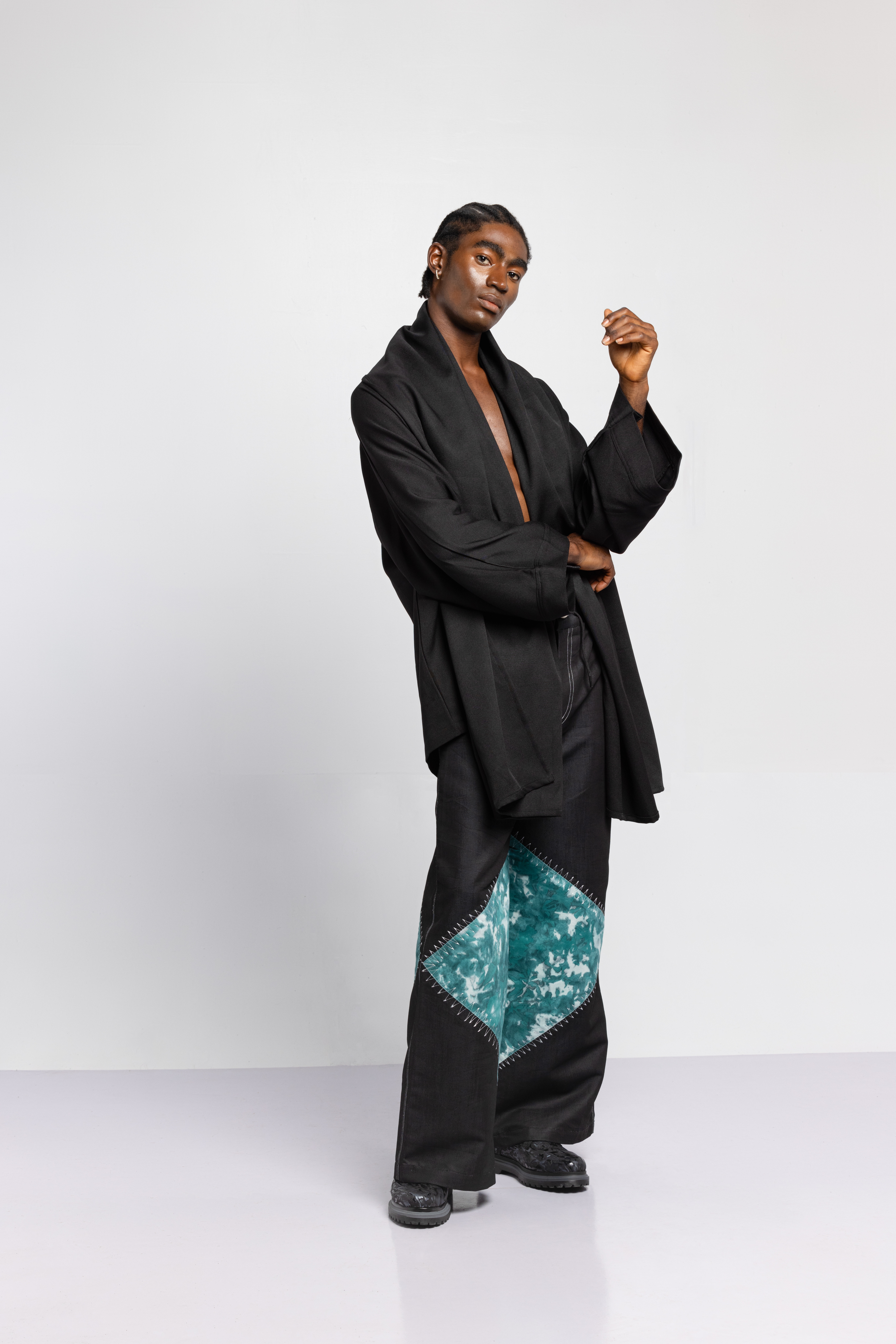 The tattoos we see today have replaced the scars that once were etched on the skin. Igboya is a reminder of the resilience of African culture, which still perseveres while evolving. This collection is nothing less than a visual symphony, with intricate embellishments, knitted pieces, and masterful textures that celebrate the monochromatic palette of black, white, grey, blue, and green. Each color tells a unique story that is etched in scars.