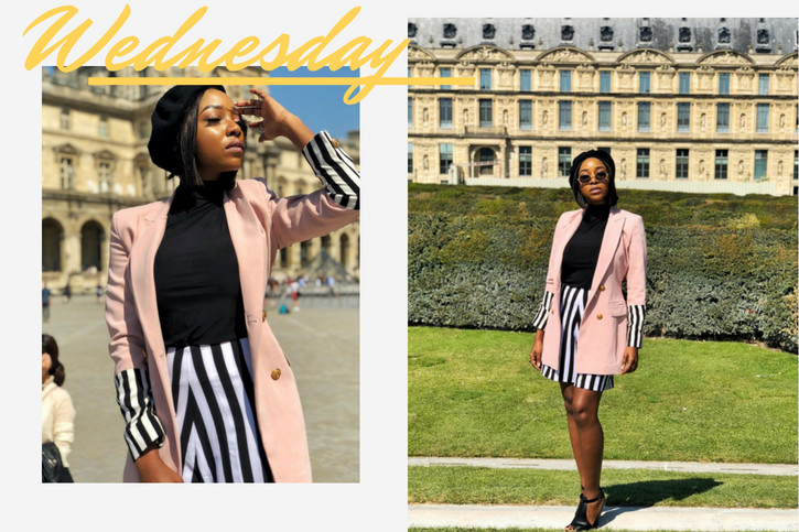 Wednesdays are streamlined and chic with more stripes and a pastel blazer. Copy this look in a work appropriate length or even better, trousers. Beret, optional.