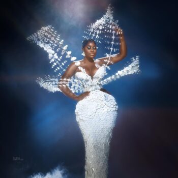 Ini Dima-Okojie was a total babe as she wore the white off-shoulder dress – which features exaggerated sleeves and asymmetrical pleats on the from a different material on one side – which she paired with dangling statement earrings and sported several silver rings. She also wore a headwrap of the same color and white framed sunshades.