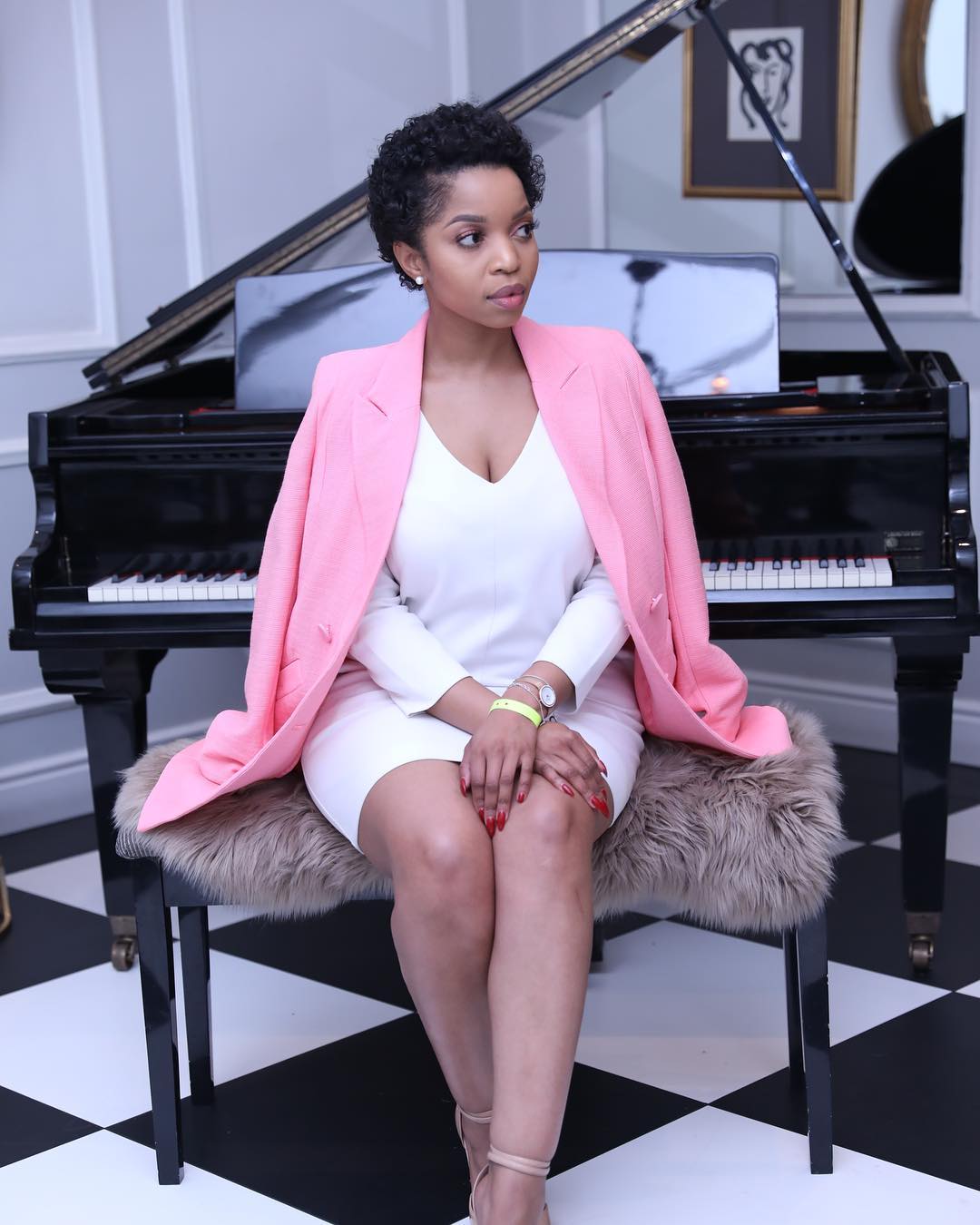 While the standard cool kid thing to do is drape a blazer on your shoulders, Lerato takes it to the next level with this fit – draping her blazer over this long-sleeved V-necked white dress and keeping everything else pristine and sharp is borderline workwear fashion genius.