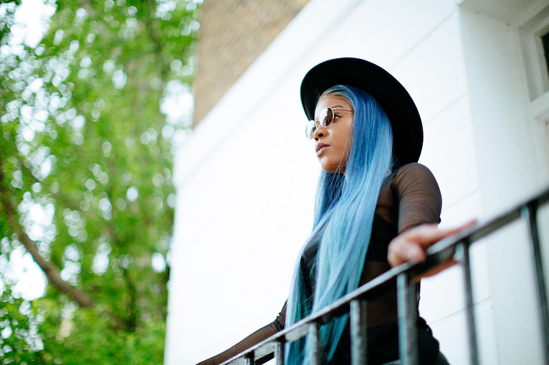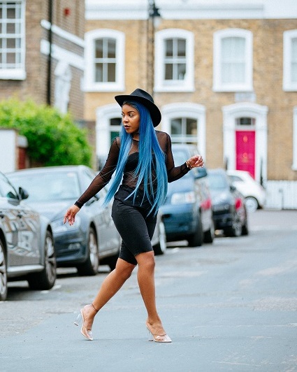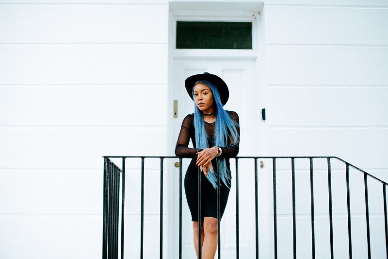 This was my favourite of all 3 outfits. To match Lola’s statement blue hair, I went for a simple all black cowgirl chic bold look. The aim was to keep the focus on her hair whilst still maintaining the cowgirl swag. I styled a fishnet mesh top with denim knee-length fitted jeans as I was going for a 90s western look.