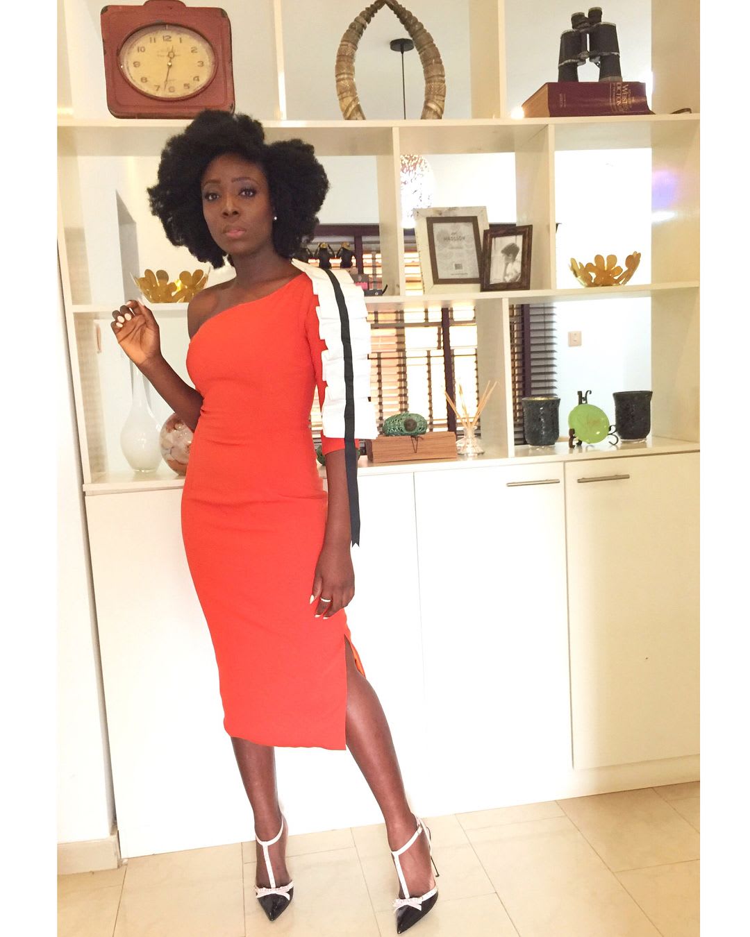 This spring summer, it’s all about adding bold color to your closet, even better add some unexpected monochromatic details like the black and white box pleat details on this autumnal orange dress.