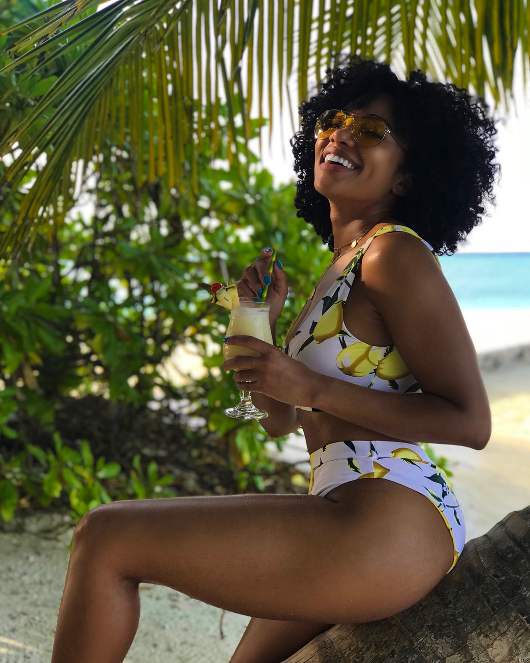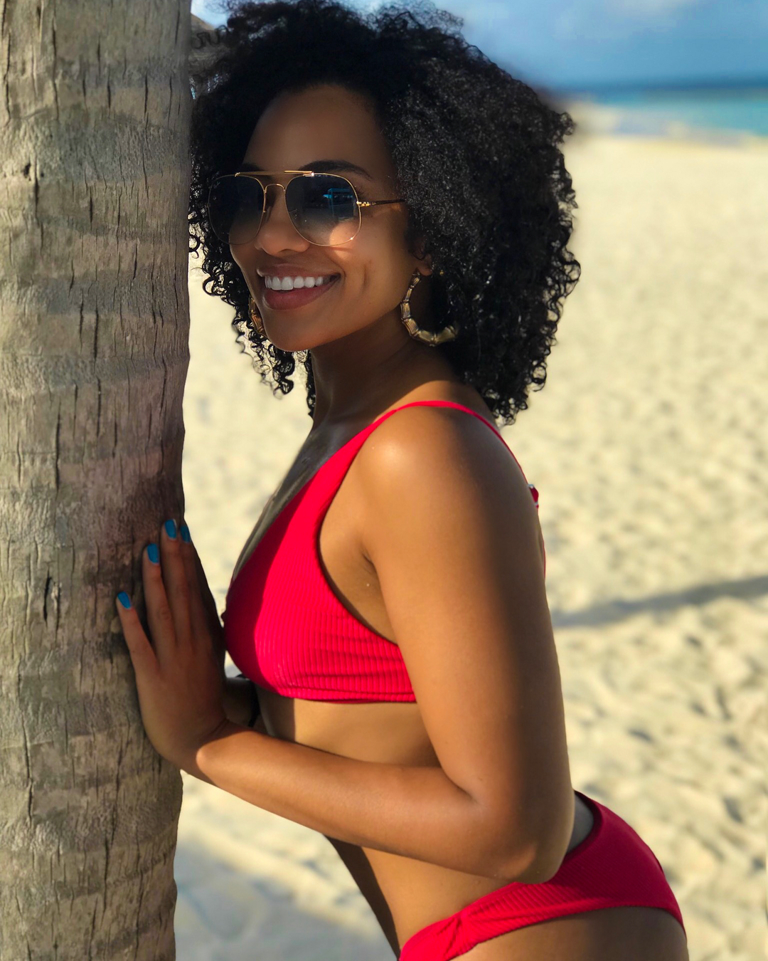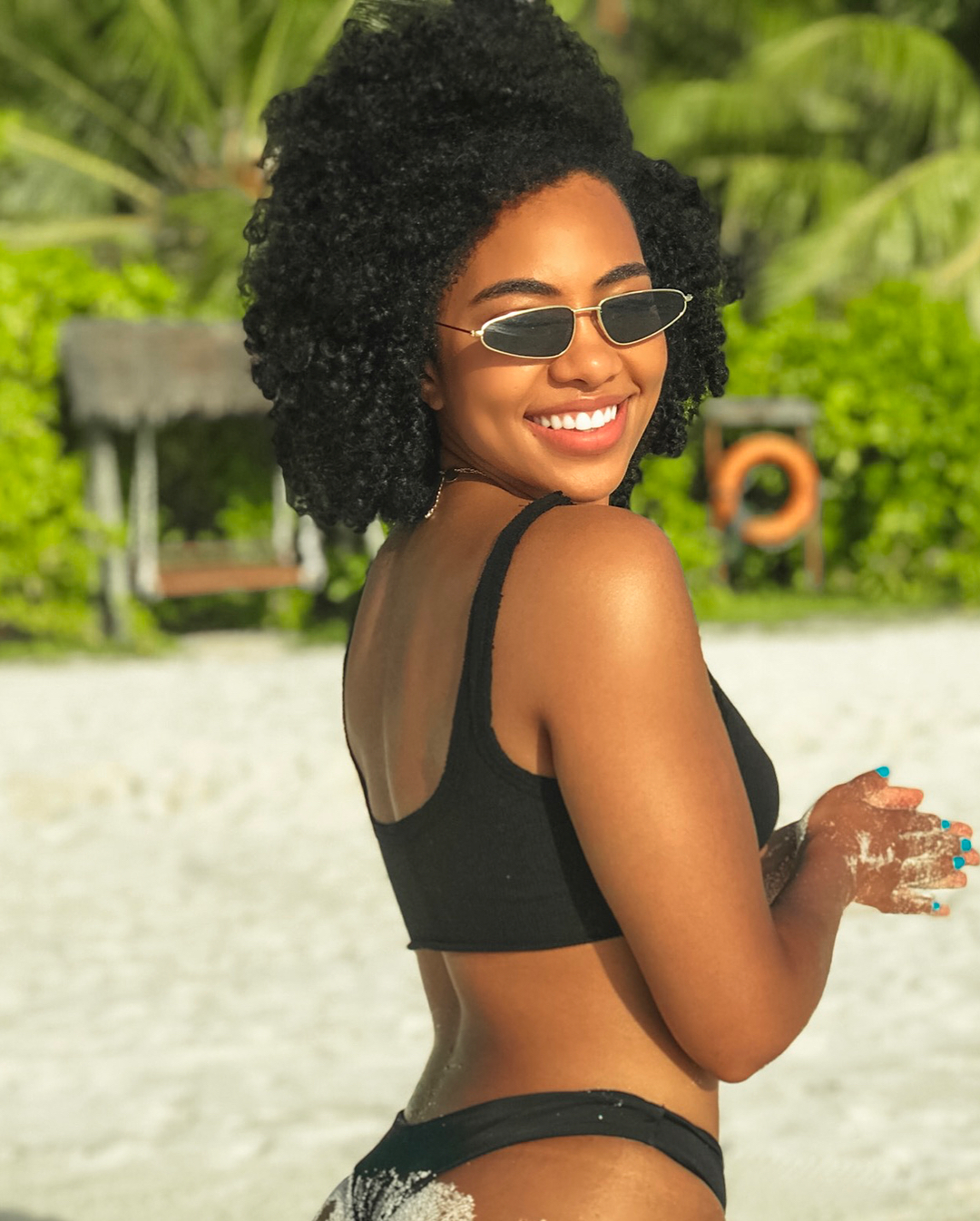 Newly engaged South African actress Amanda du Pont‘s style on her epic Maldives trip was a masterclass in upgrading your beachside style. The actress’s recent sun-drenched trip felt like a digital travel guide to the Maldives and her itsy bitsy bikini looks were as chic as her exotic environs. Whilst we love playing fashion voyeur, and living vicariously through her Maldives adventure is uber fun, you can actually channel Amanda’s style on your next vacation . Think wild curly hair and a considered approach to accessories like a sunhat or minimalist jewelry to elevate your bikini . Or edgy sunglasses that made her beach-side looks more directional and put together.
