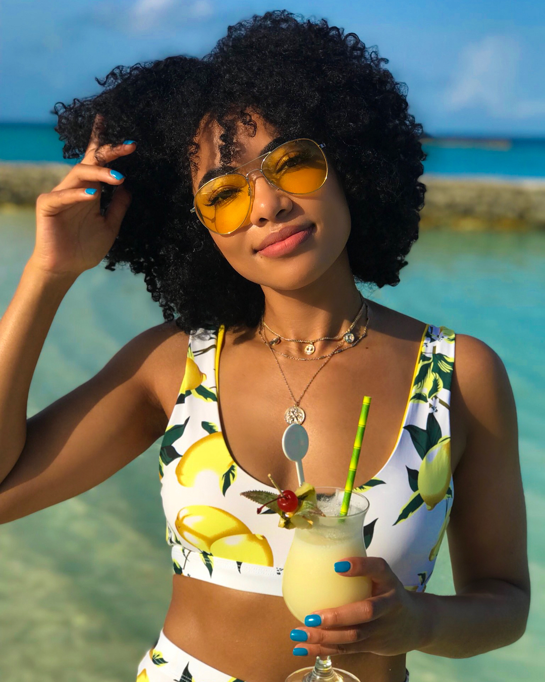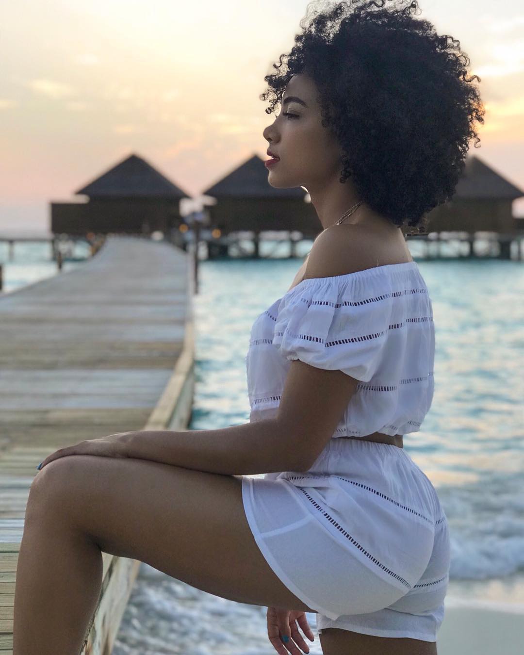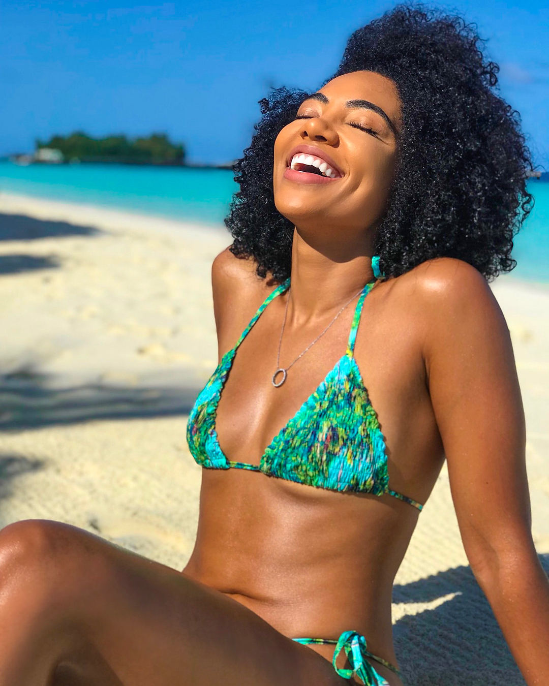 Newly engaged South African actress Amanda du Pont‘s style on her epic Maldives trip was a masterclass in upgrading your beachside style. The actress’s recent sun-drenched trip felt like a digital travel guide to the Maldives and her itsy bitsy bikini looks were as chic as her exotic environs. Whilst we love playing fashion voyeur, and living vicariously through her Maldives adventure is uber fun, you can actually channel Amanda’s style on your next vacation . Think wild curly hair and a considered approach to accessories like a sunhat or minimalist jewelry to elevate your bikini . Or edgy sunglasses that made her beach-side looks more directional and put together.