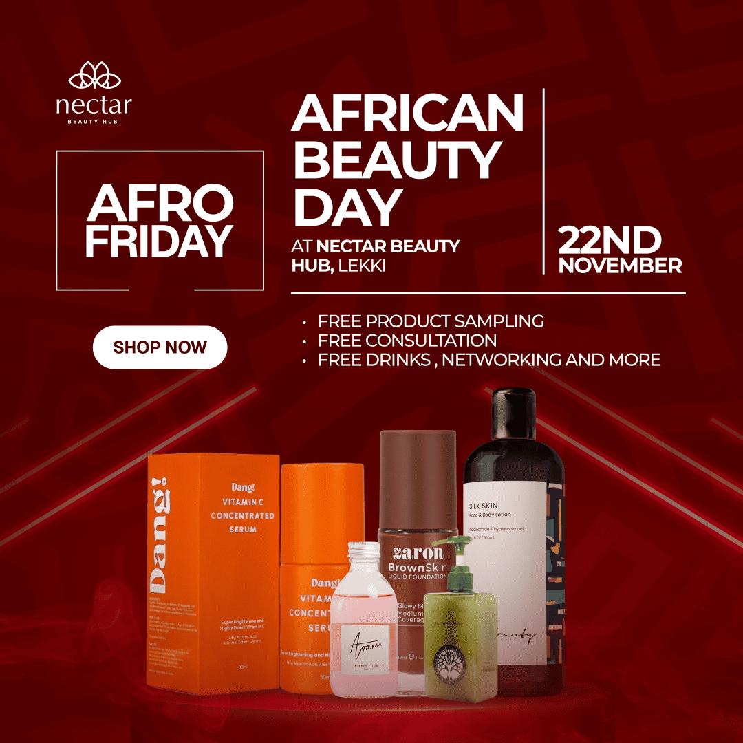 Nectar Beauty Hub—Lekki, Lagos is proud to announce the inaugural Afro Friday celebration next Friday, 22nd November 2024, at Nectar Beauty Hub, Lekki. This momentous event honours the vibrant beauty and resilience of African cultures and showcases the best of African skincare brands and products.