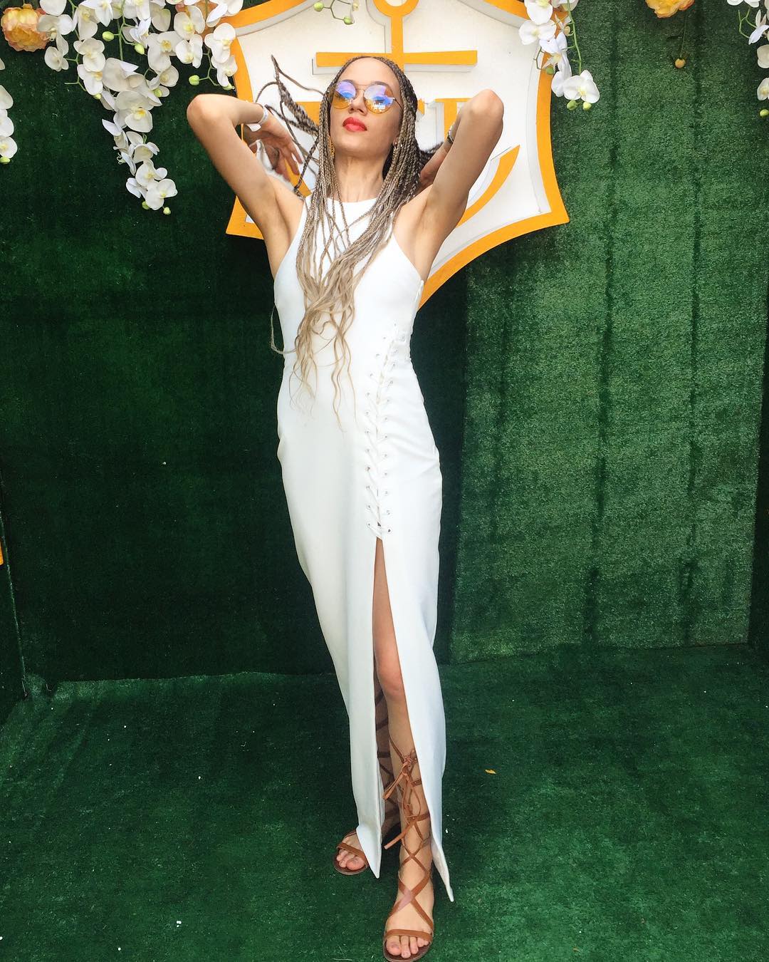 She amped up the fuss-free silhouette and a muted colour with golden blonde braids and oversized sunglasses. We love how the dress sculpts her lithe frame and the cheeky slit, which also acts as a way to showcase her statement gladiator sandals.