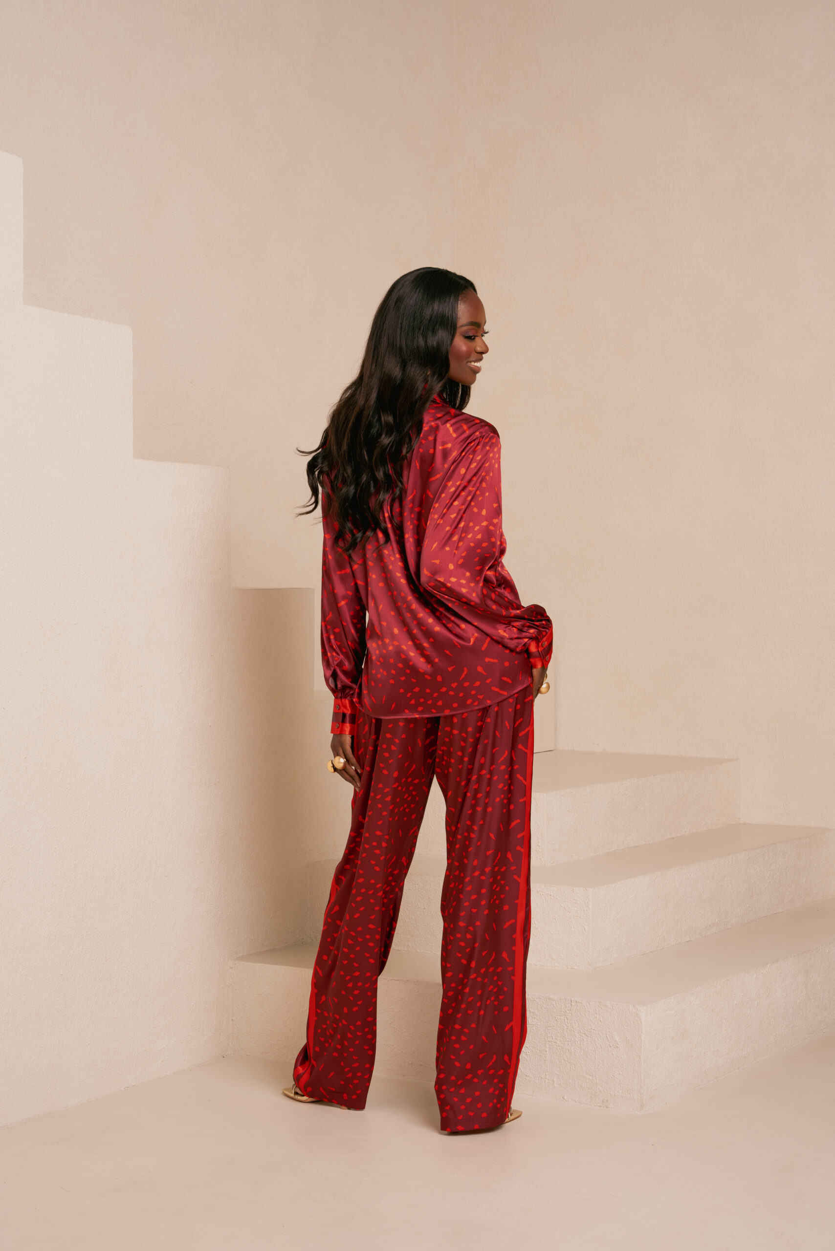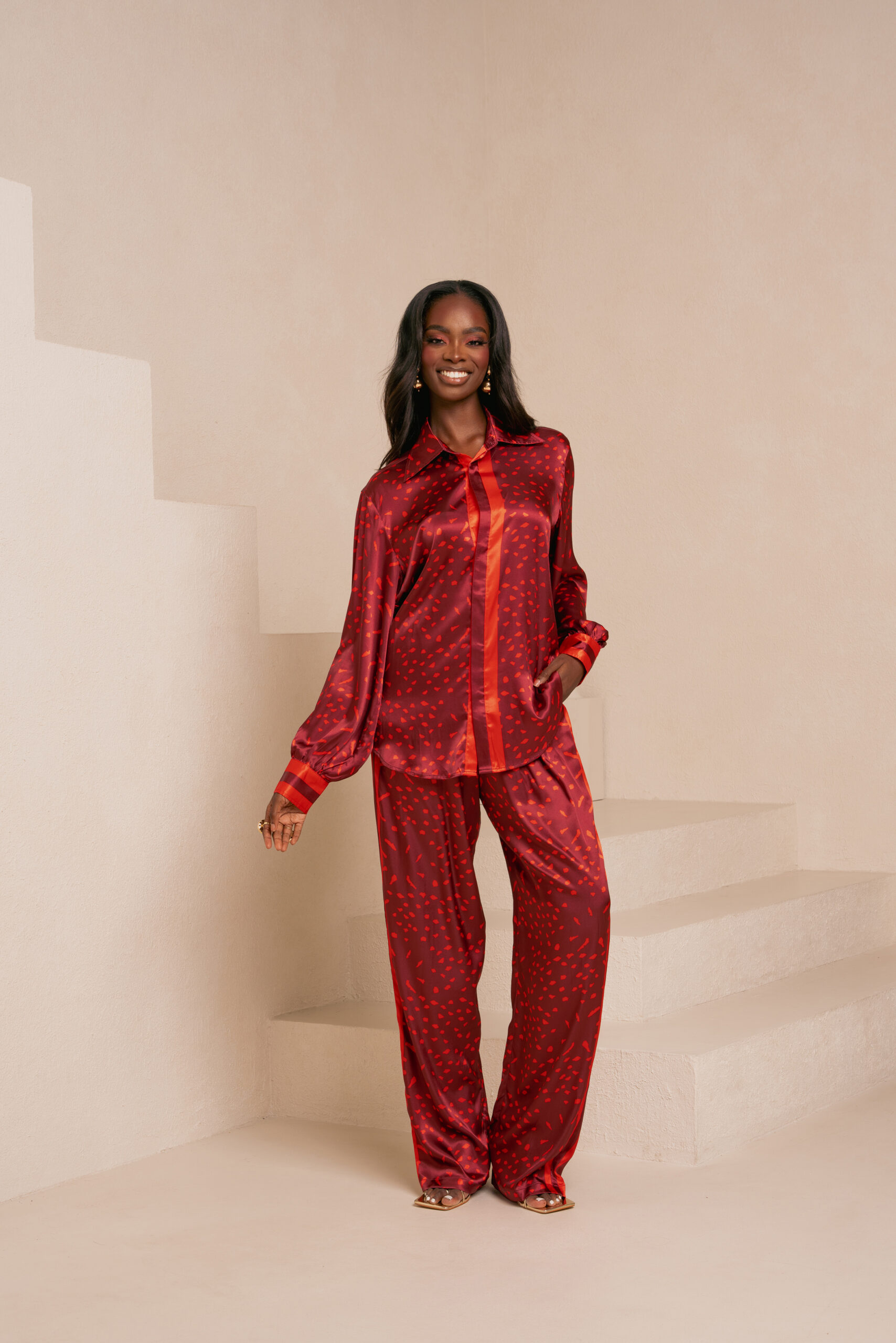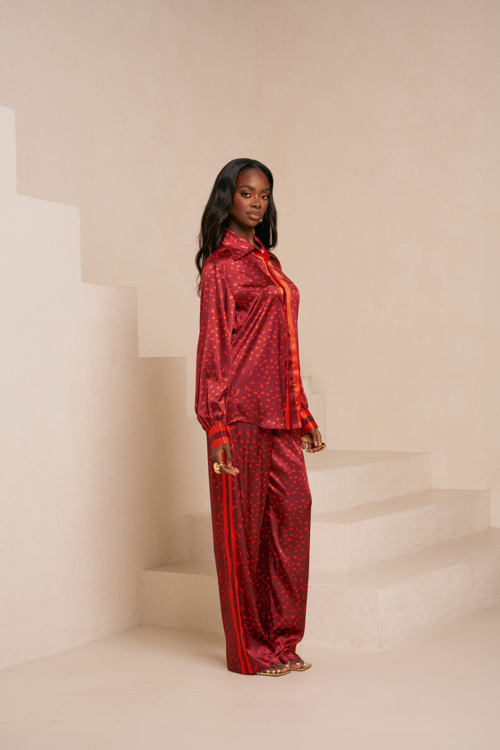 AMINAH RED BUTTON-UP SHIRT | AMINAH RED PANTS (STRAIGHT LEG)