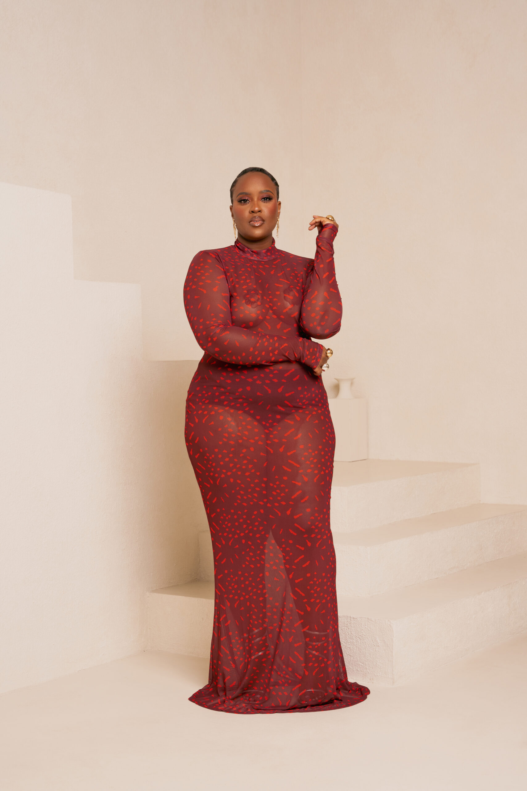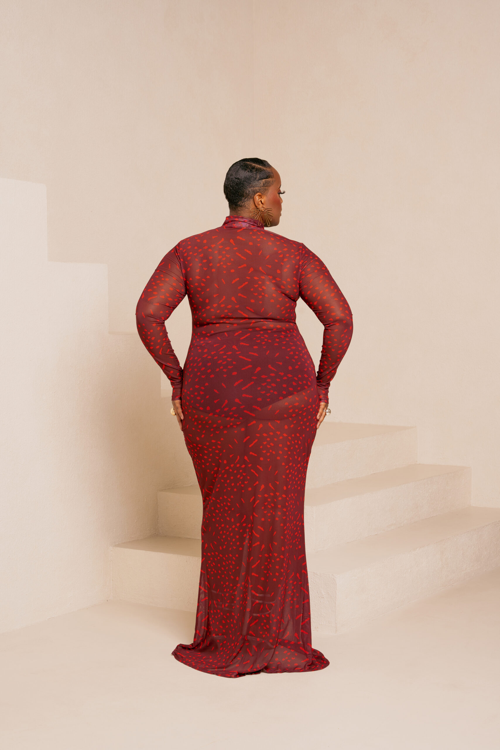 ANU RED LONG SLEEVE MAXI MESH DRESS