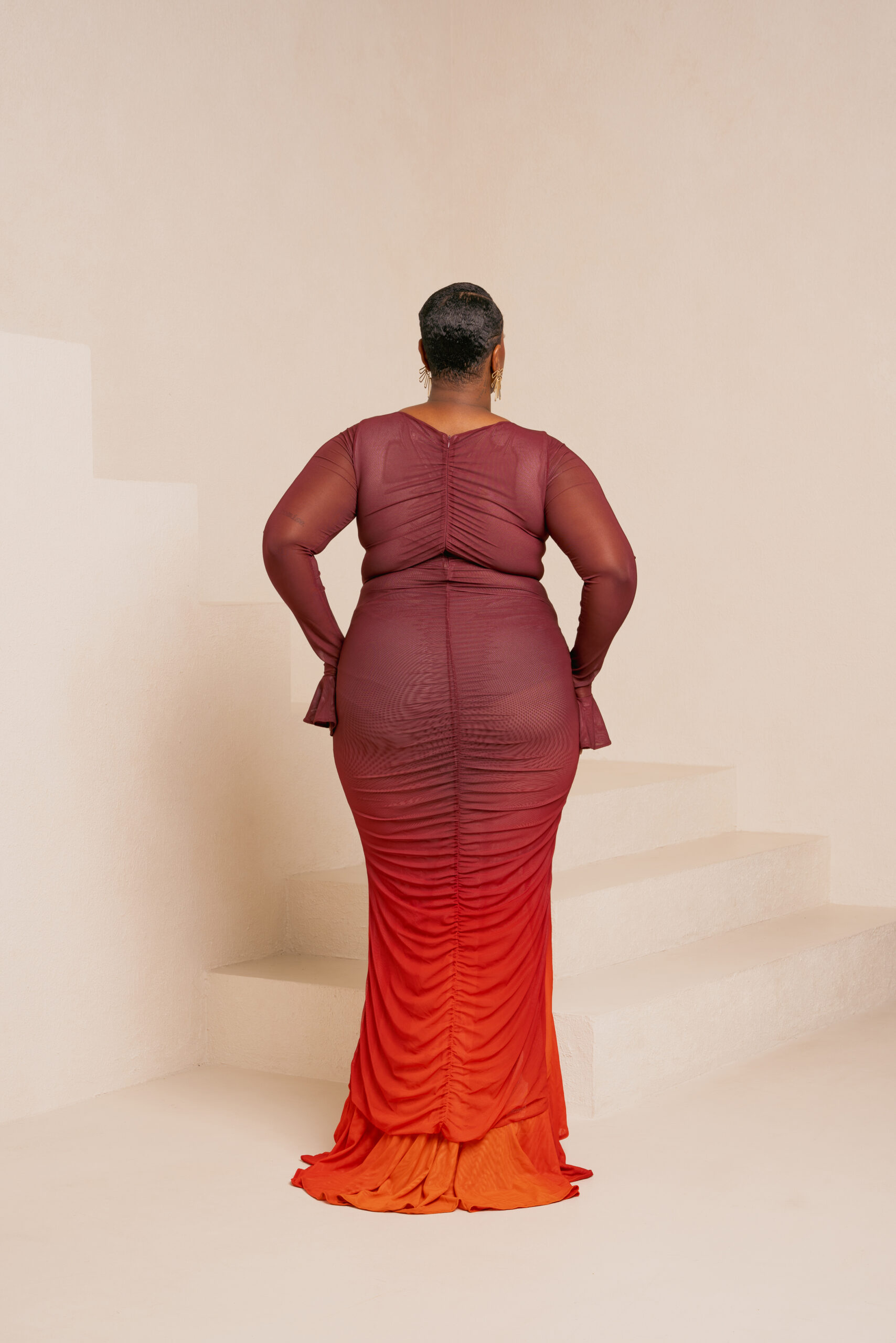 IZA ORANGE RUCHED MAXI MESH DRESS
