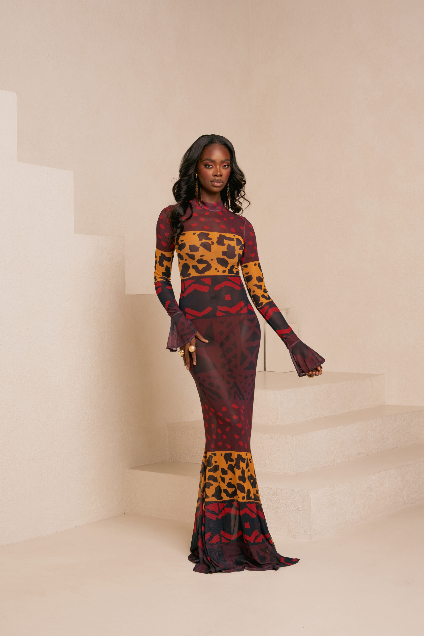AMINAH RED LONG SLEEVE MAXI MESH DRESS
