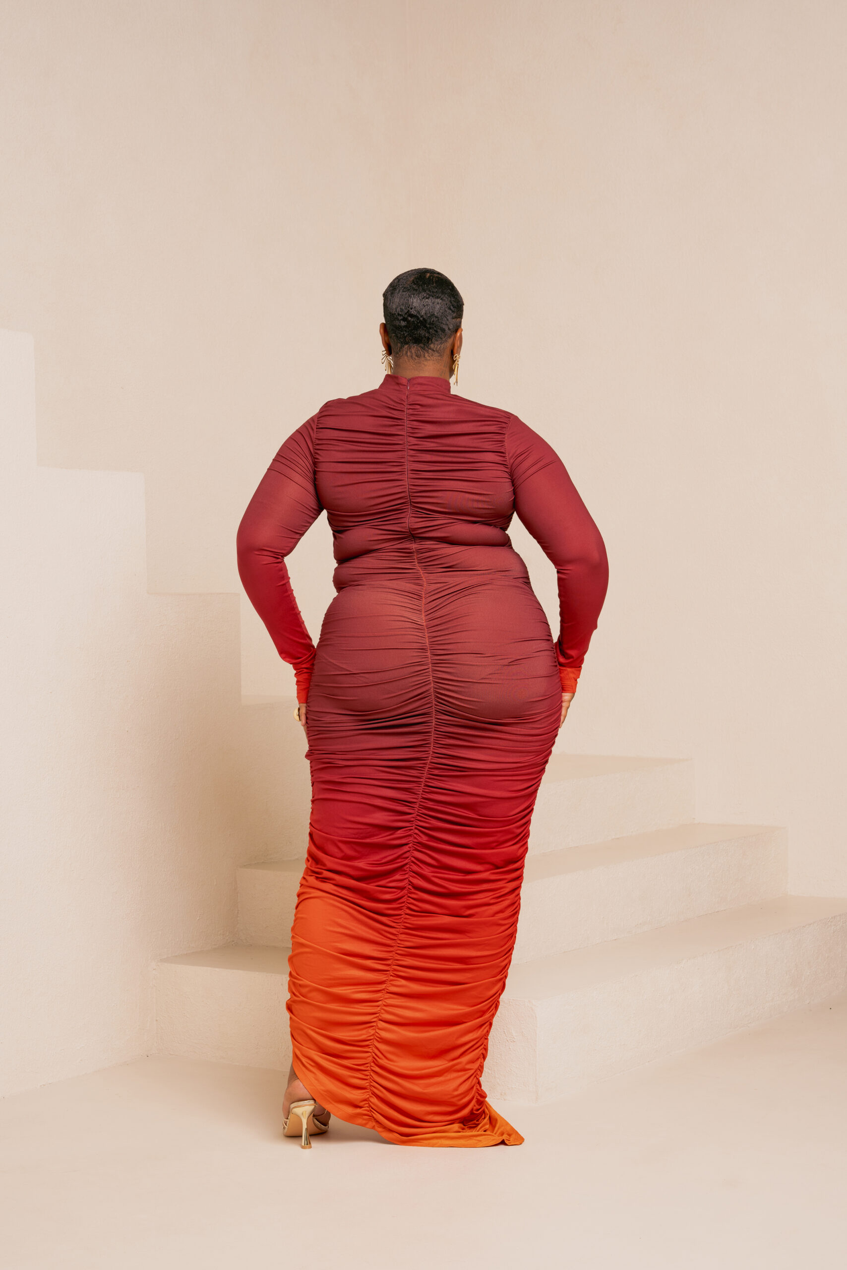 AMINAH ORANGE RUCHED MAXI KNIT DRESS