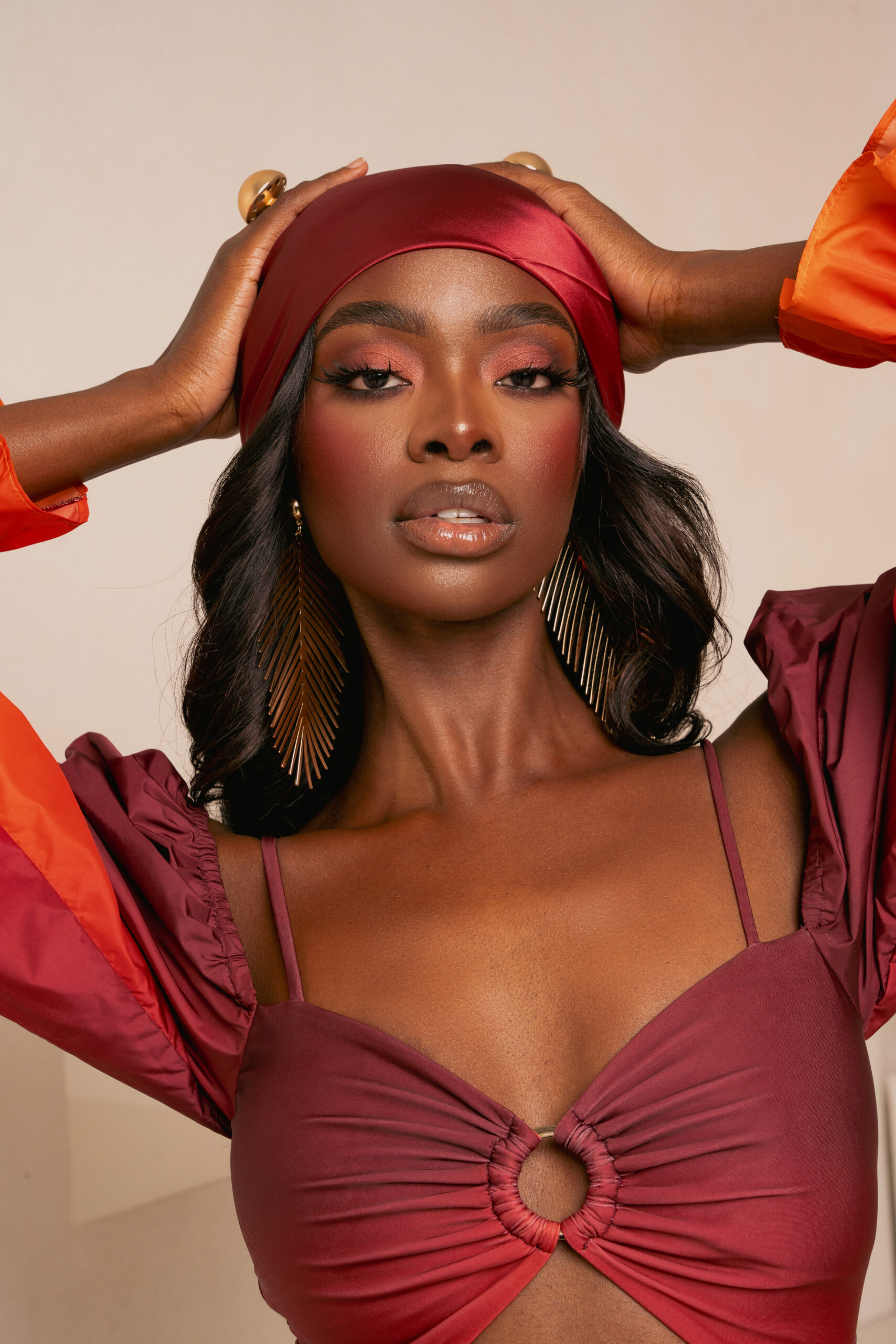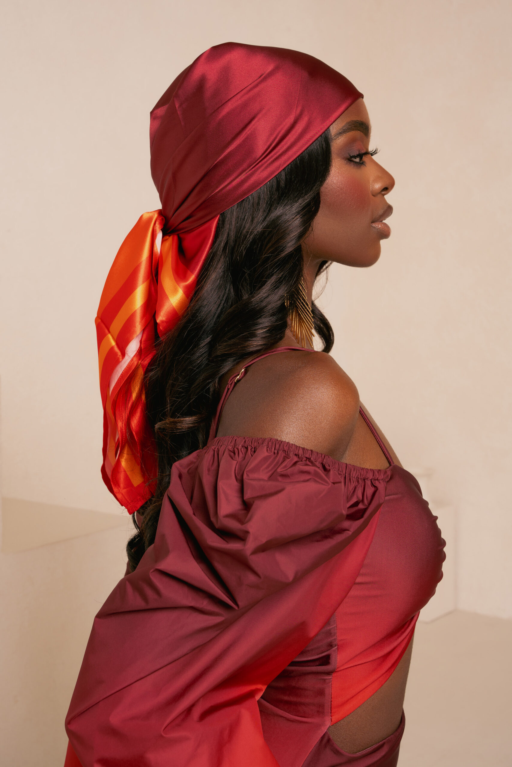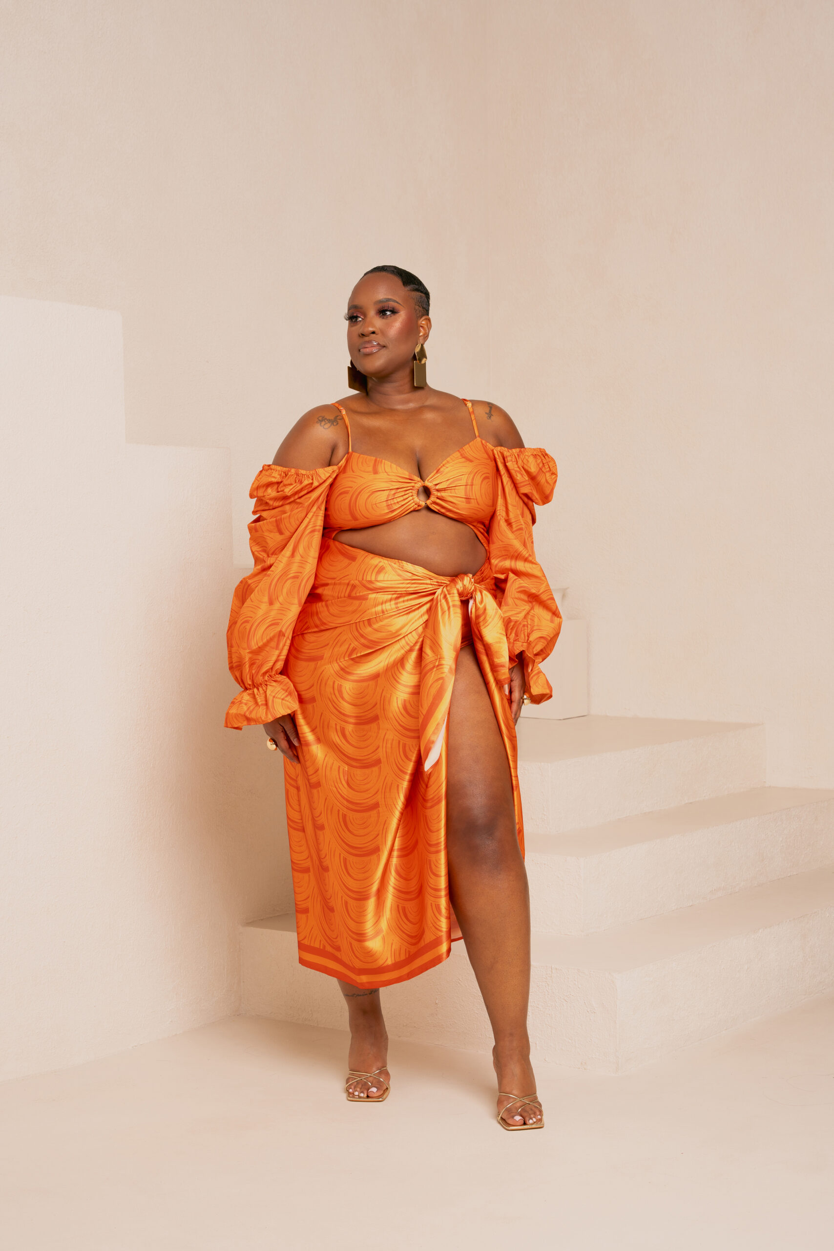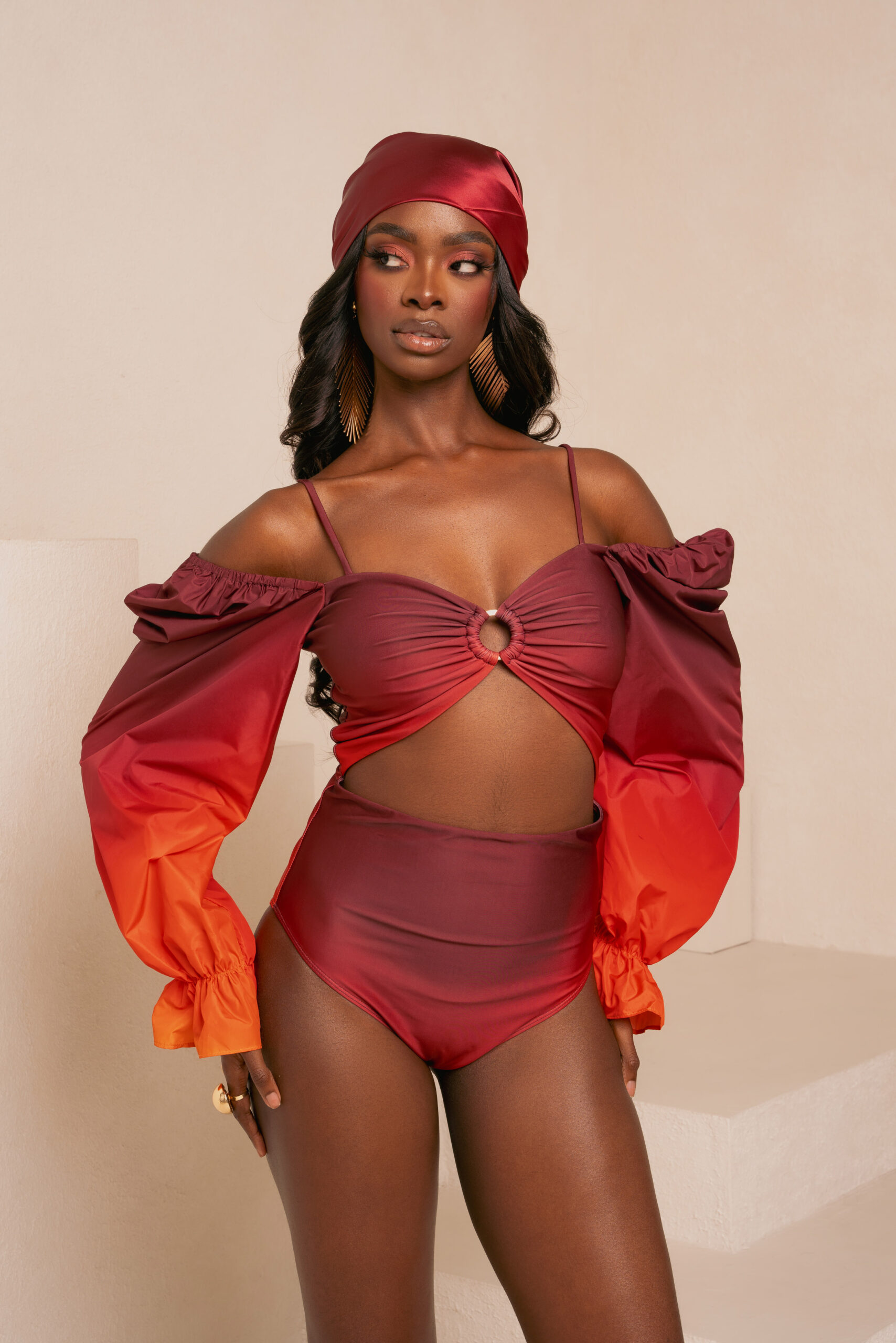 IZA ORANGE OFF SHOULDER PUFFY SLEEVE SWIMSUIT | IZA ORANGE SMALL SILK SCARF