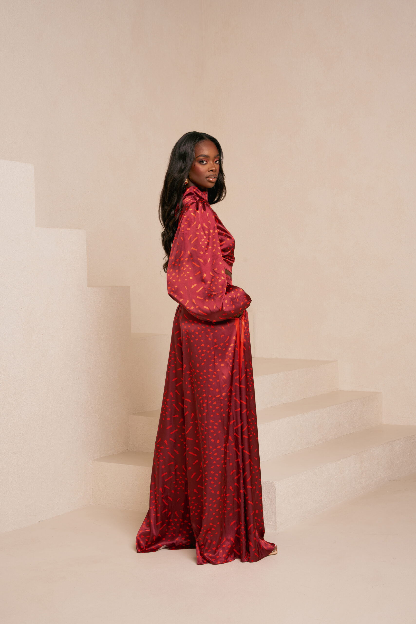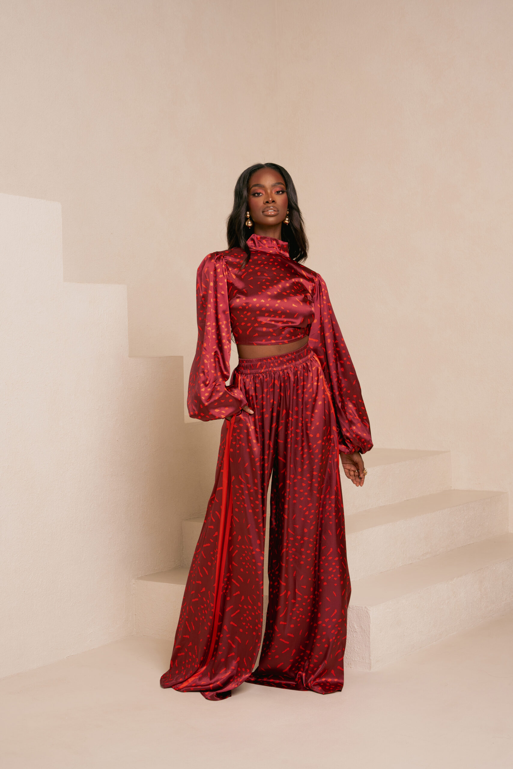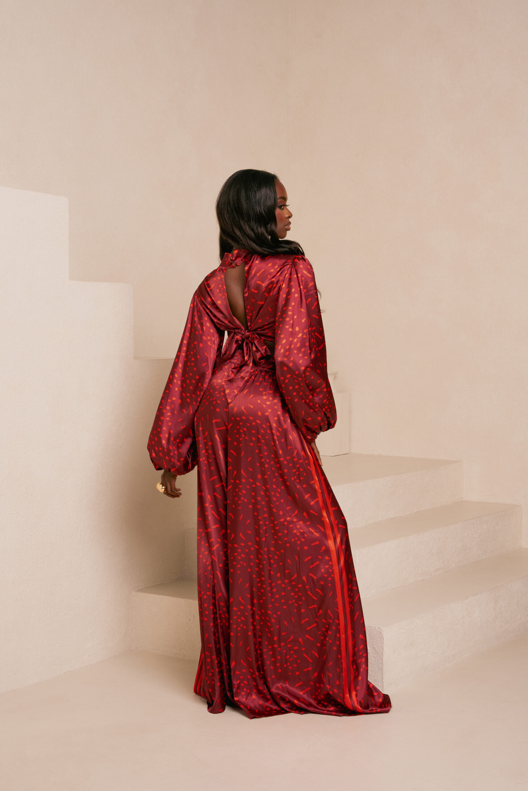 AMINAH RED LONG SLEEVE BACK TIE CROP TOP | AMINAH RED WIDE LEG PANTS