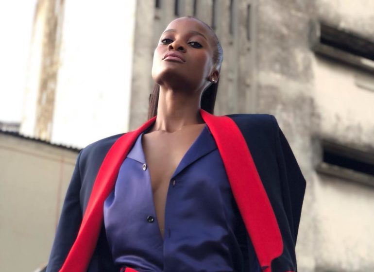 The Ghanaian BellaStylista made a bold statement in a blue Duaba Serwa quarter-length origami textured skirt paired with a white button-up shirt and Amina Muaddi‘s blue PVC heels with a metallic Chanel quilted bag.