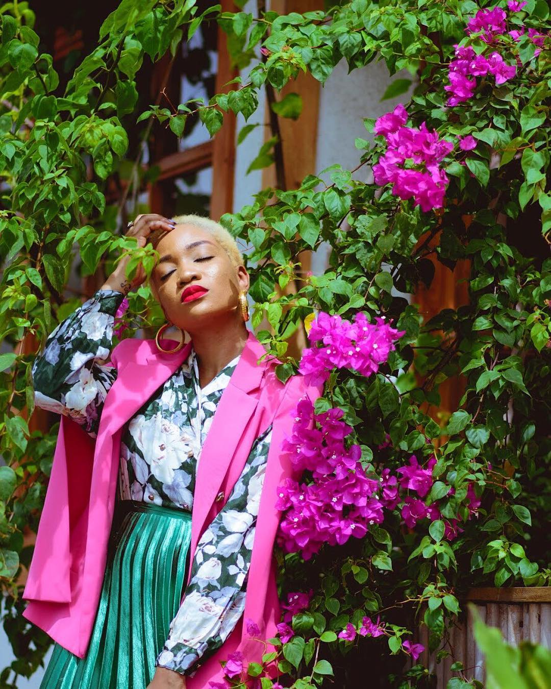This piece can be very tricky to style, but this BellaStylista pulls it off with aplomb. She finished off the stellar outfit with thick gold hoops, a popping red lip and her signature blonde TWA.