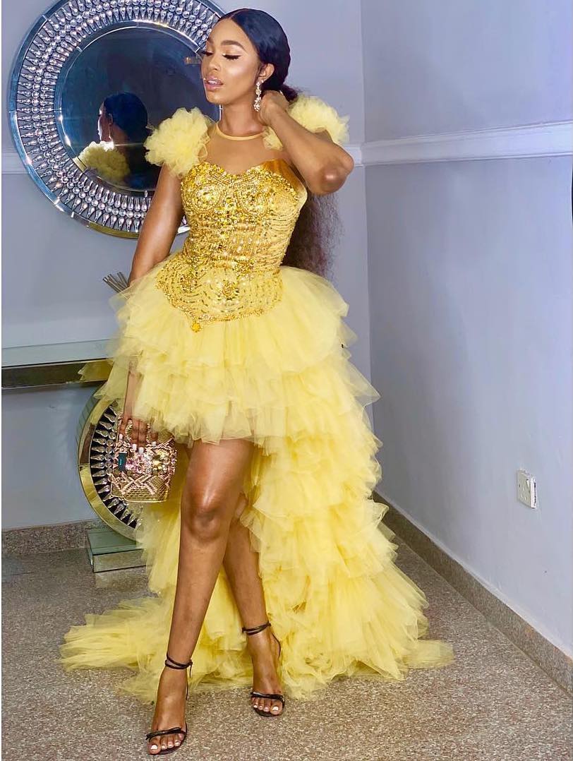 Shaffy Bello took us by surprise in a floral midi dress designed by STITCHES by Chioma. The veteran actress is known for her floor-length gowns at red carpet events but the sweetheart pink dress with petala-shaped ruffles topped with a statement flower-headpiece, was a welcome turn of events.