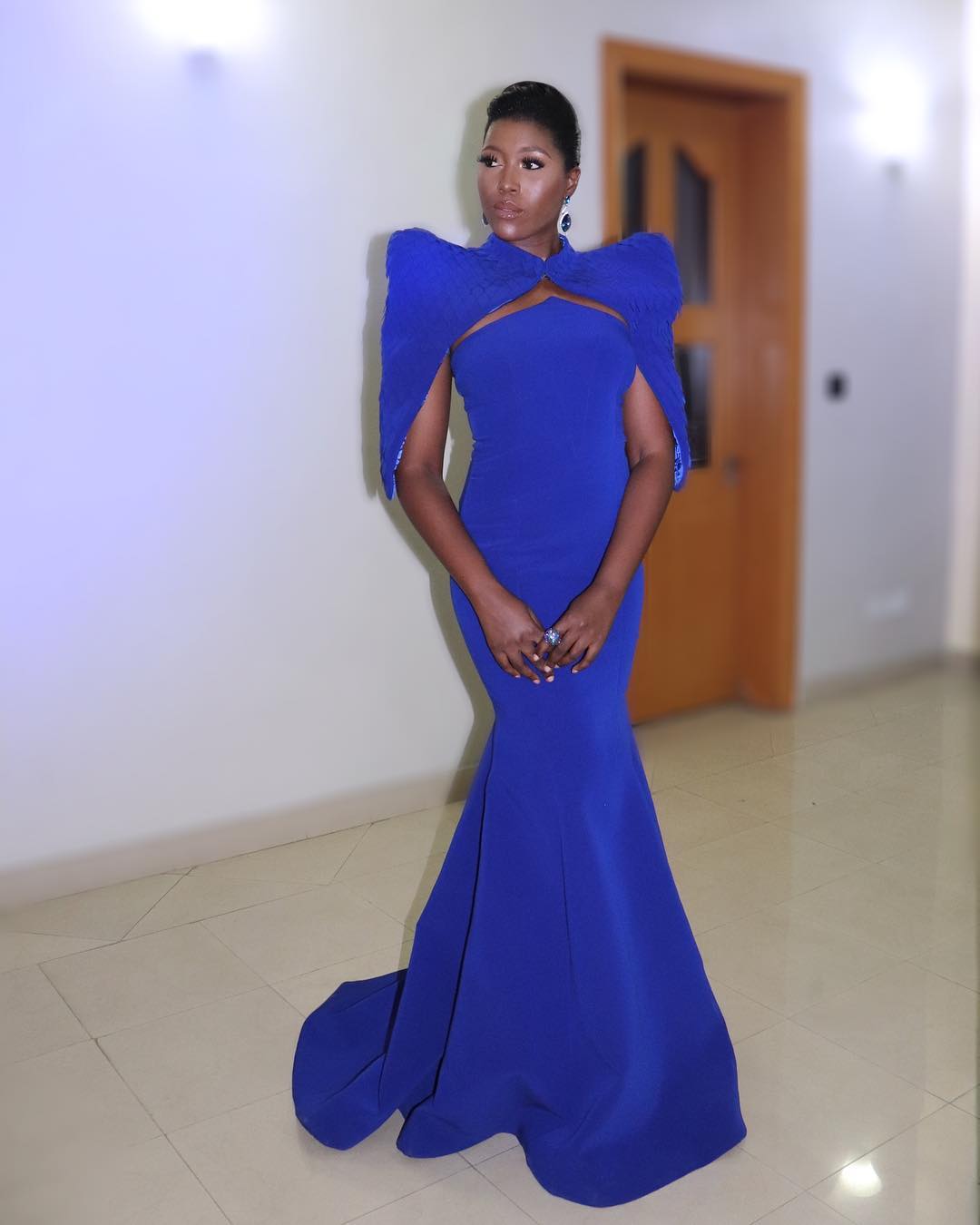 Wowing on the red carpet, Vimbai looked elegant in a custom Pmluxury dress with a matching wing-like addon cape.