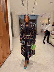 Powede stepped out in what might just be one of the prettiest statement jackets we’ve seen in a while, a stunning colourful piece from Nigerian fashion brand Maison Nwosu. The jacket features a structured black base brought to life with a grid of vibrant, multicoloured textured detailing that instantly turns the coat into wearable art. It’s bold without being loud, playful yet still very polished.