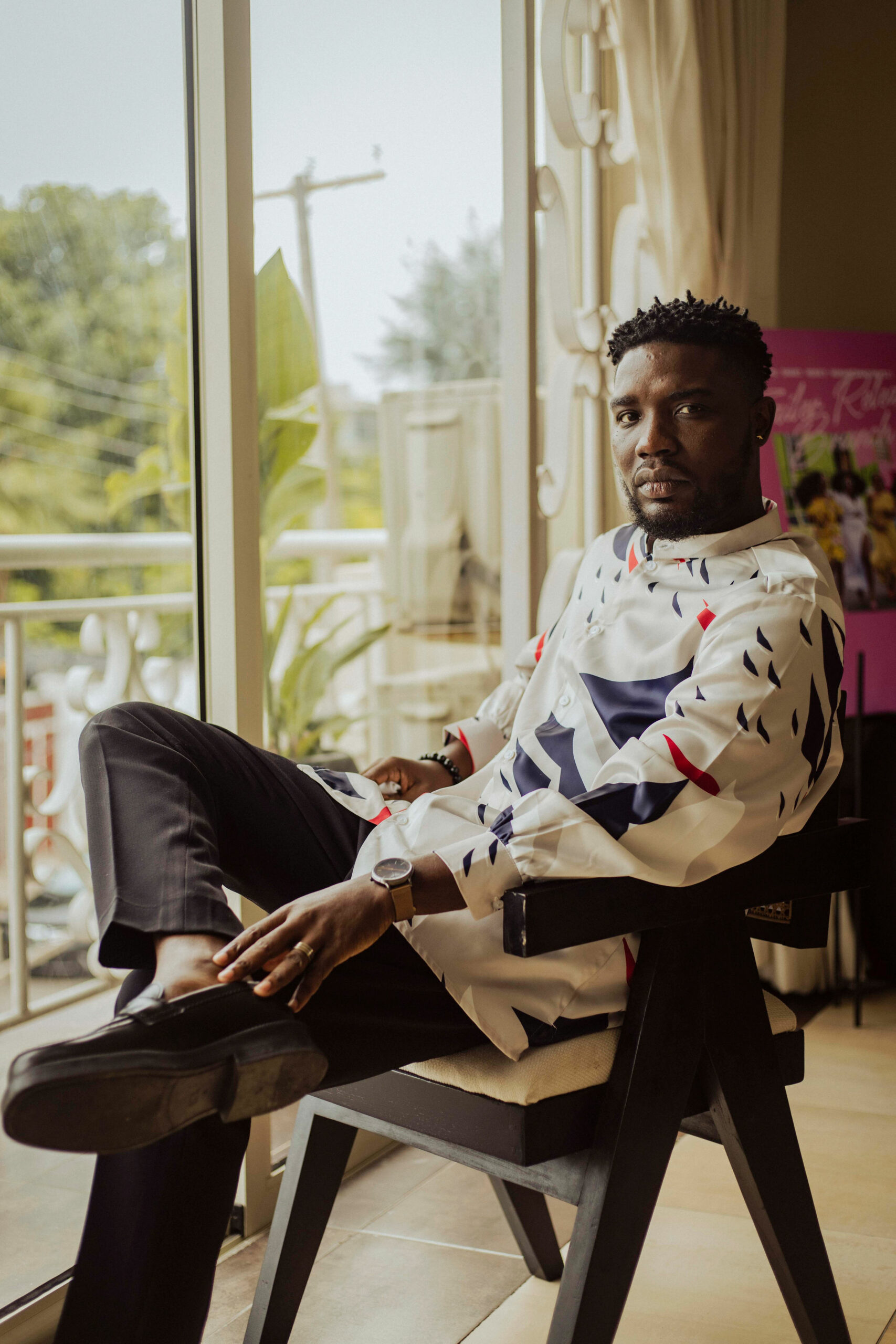 Seun Ajayi continued his era of laid back elegance in a print shirt and tapered pants.